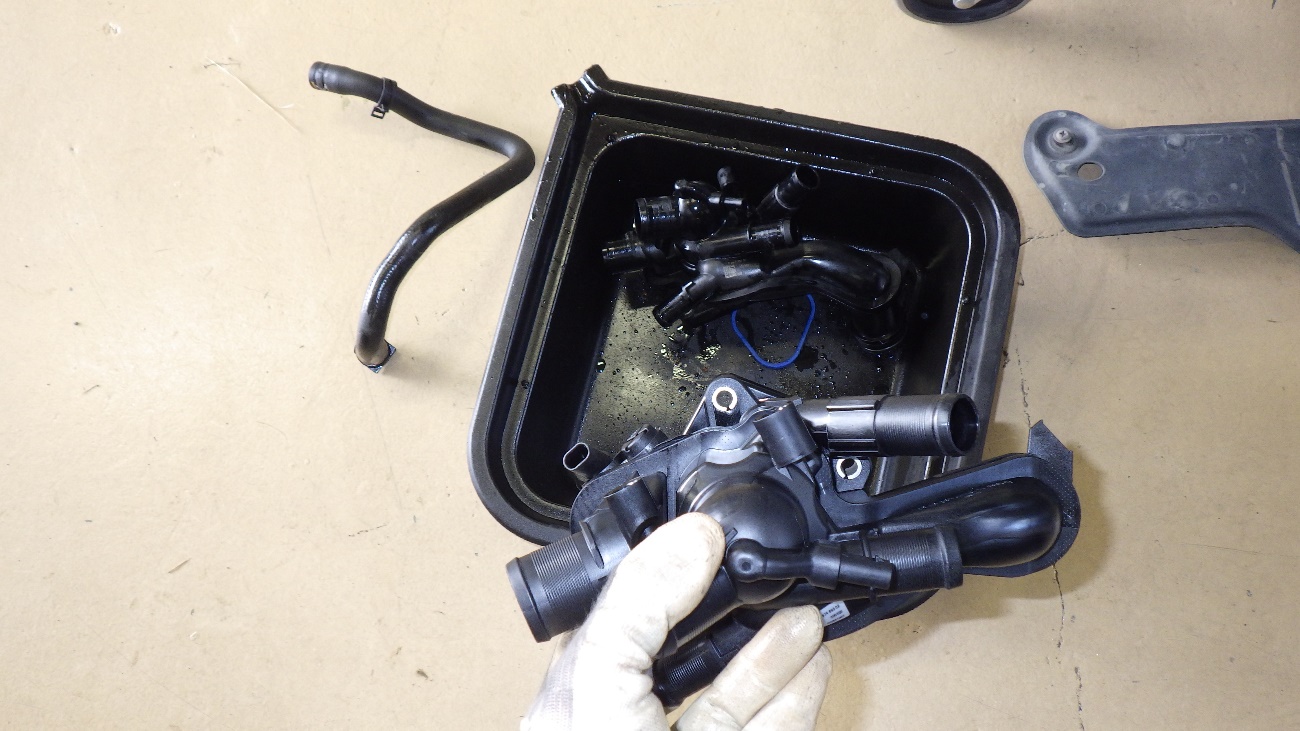 診断した結果、サーモケースよりLLCが漏れておりましたので交換作業に取り掛かります。