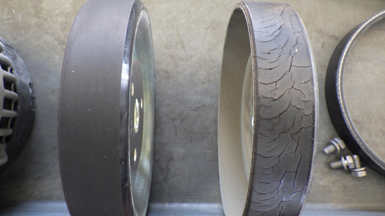 ウォーターポンププーリーの断面図になります。ゴム部が完全にクラックが入っておりましたのでこちらも交換させていただきます。
