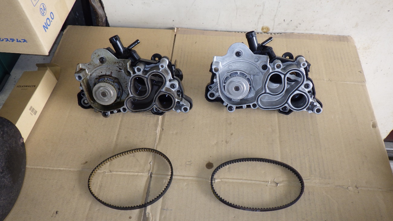 取り外したウォーターポンプASSYと新しいウォーターポンプASSYになります。