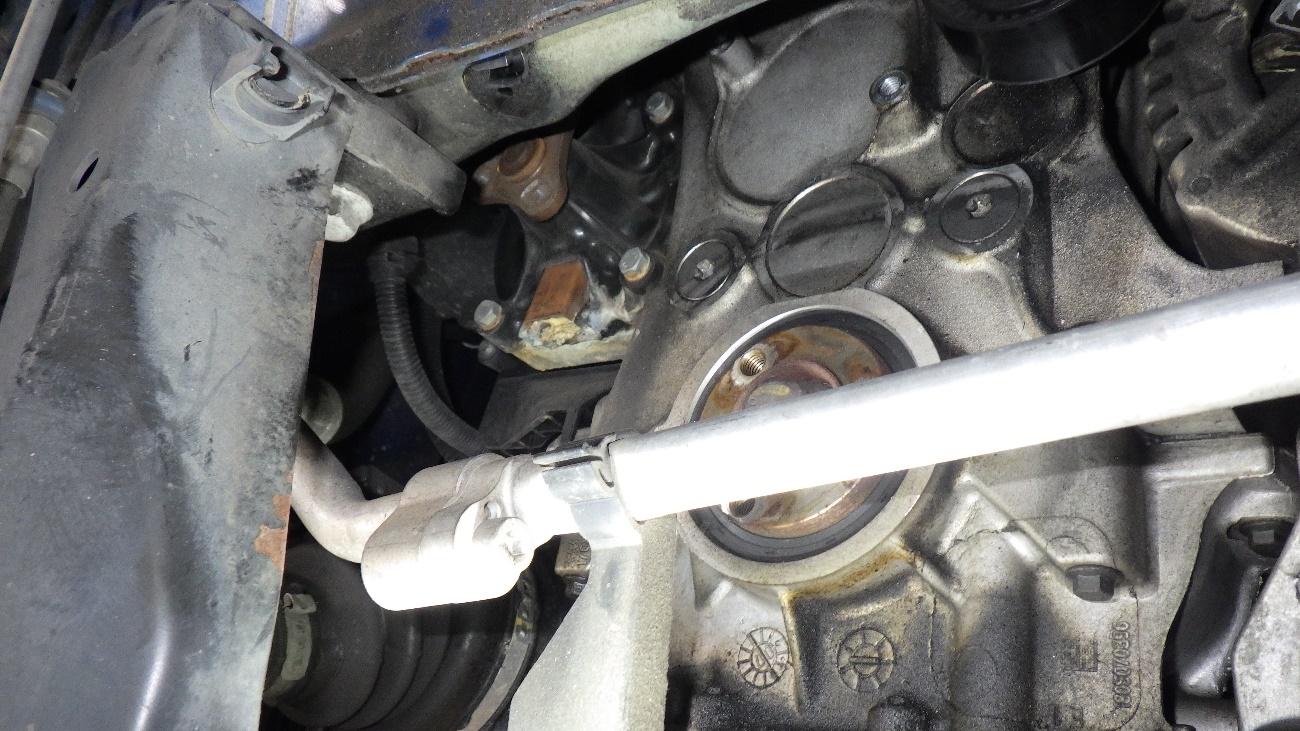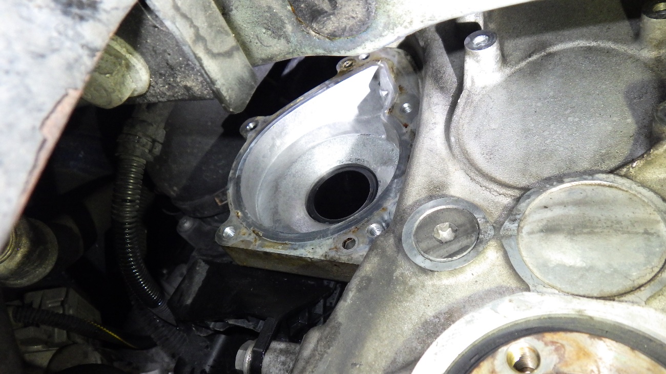 ウォーターポンプの拡大図になります。ウォーターポンプ下部よりLLCが漏れておりました。