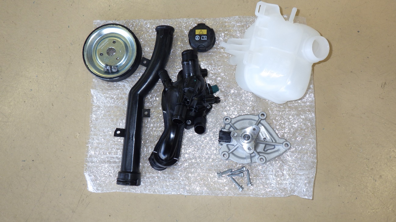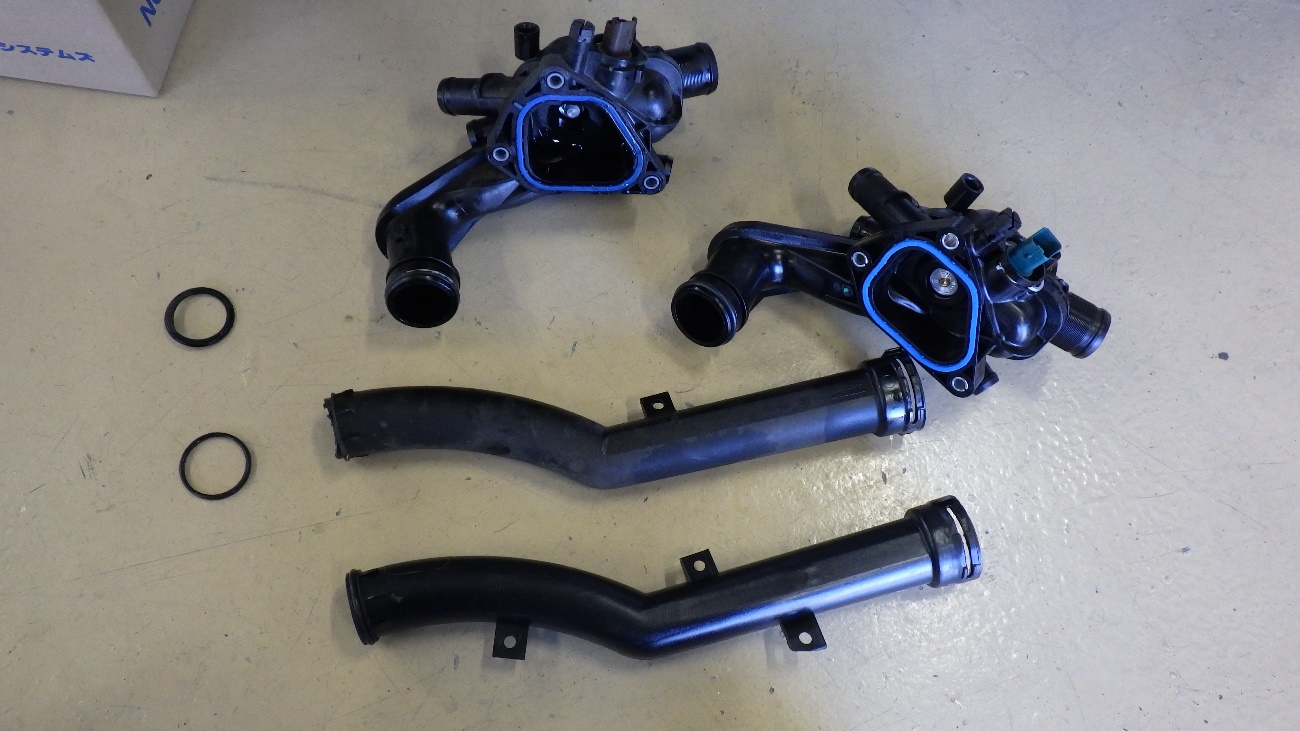 取り外したサーモケースASSYとウォーターパイプと、新しい部品になります。