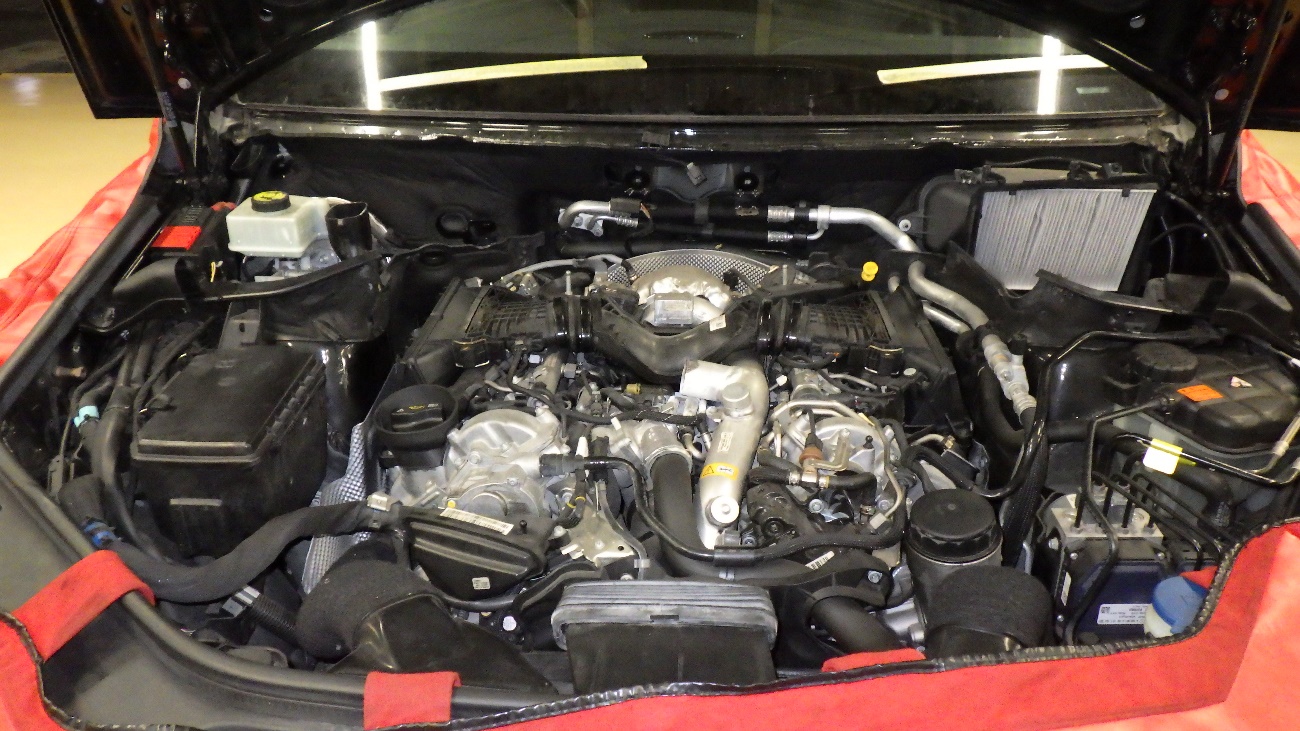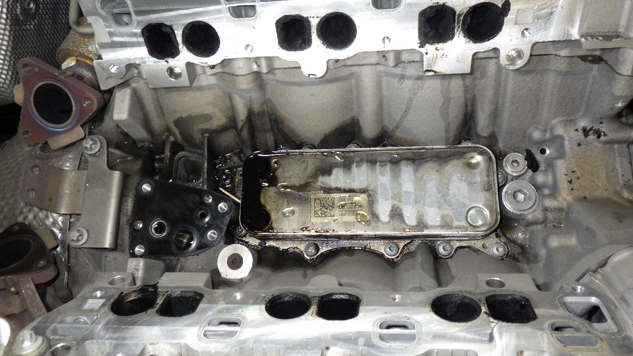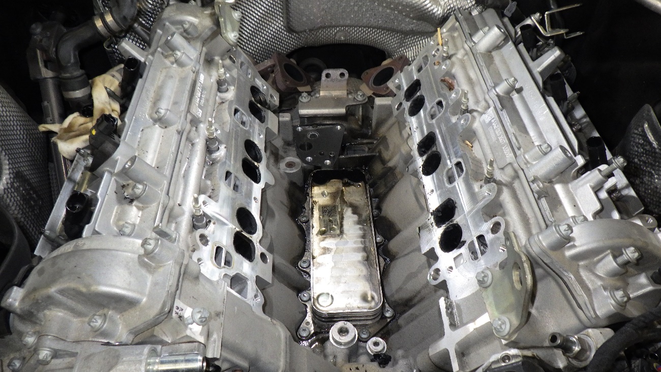 診断させていただいた結果、V型エンジンの間のオイルクーラーからエンジンオイルが漏れておりました。