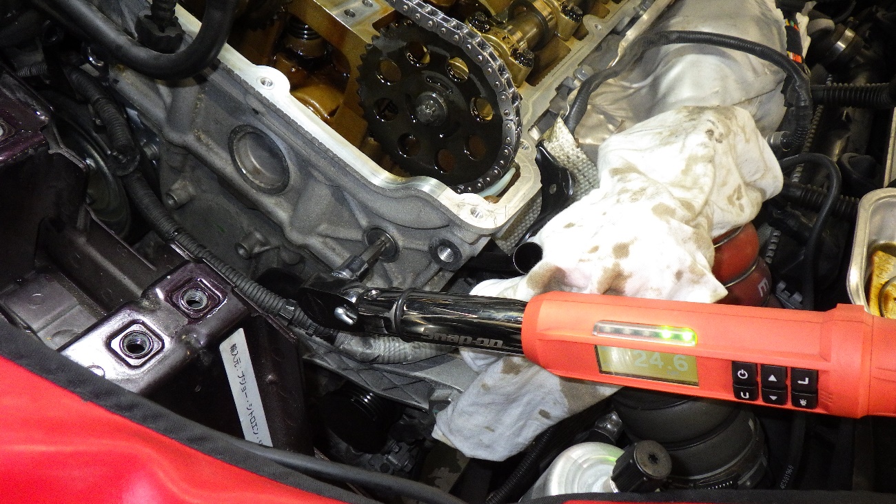 タイミングチェーンテンショナーを規定トルクにて締め付けている様子になります。