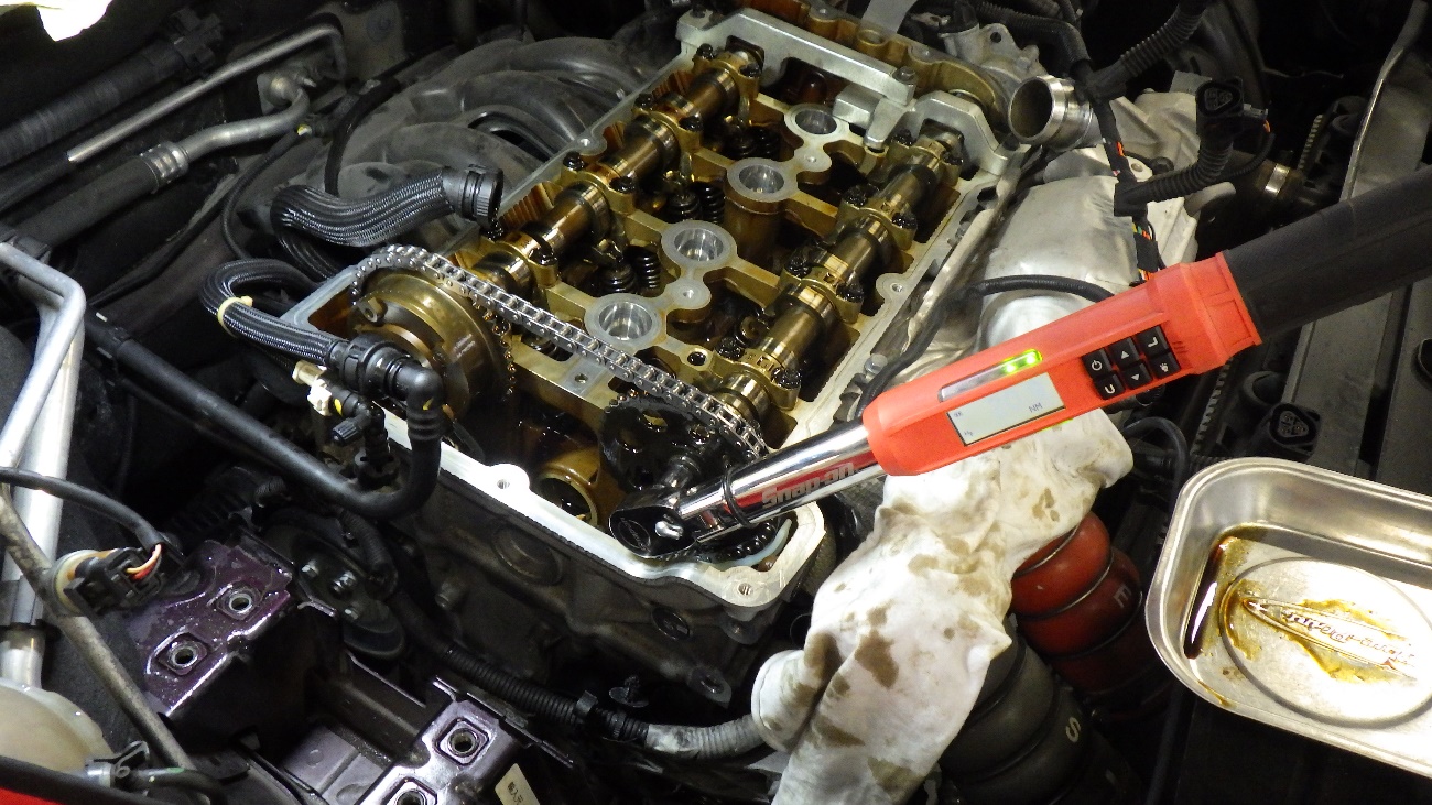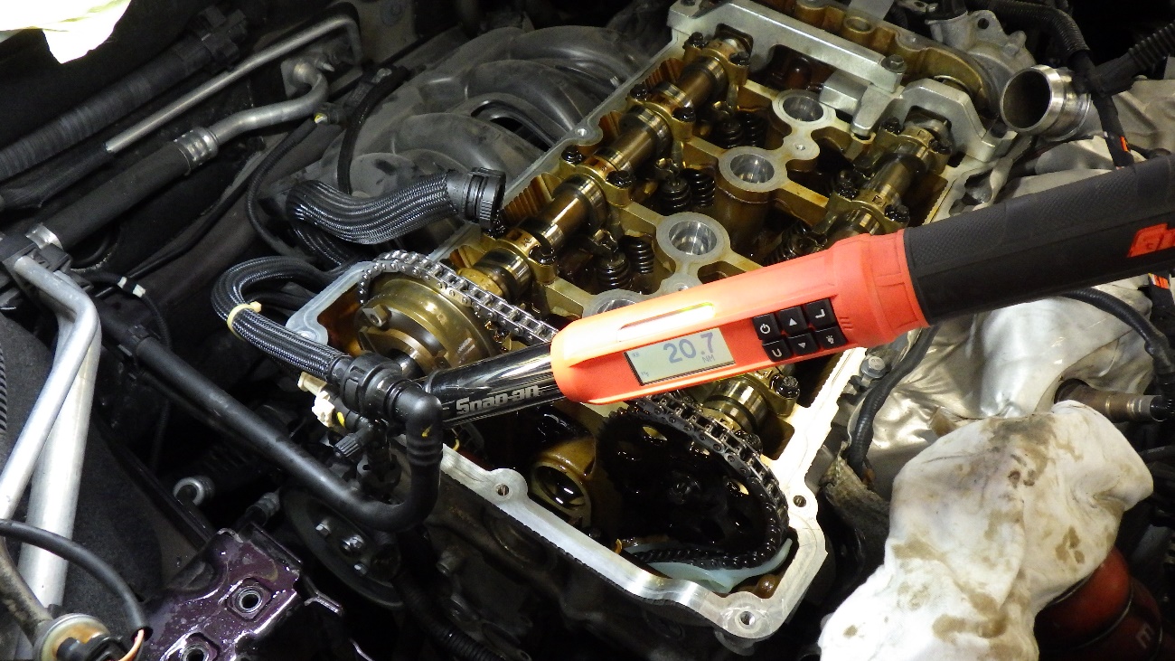カムシャフト(VANOS)を規定トルクにて締め付けている様子になります。
