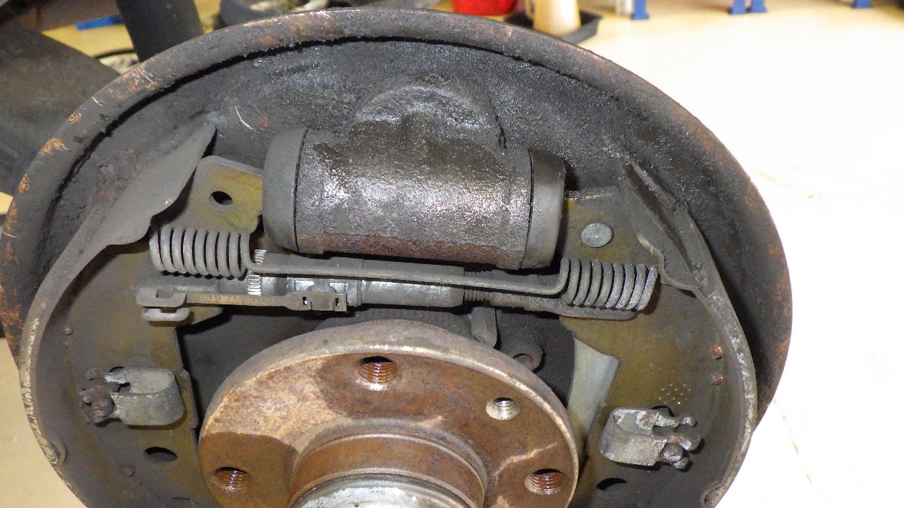 左側のドラムを外した結果、ホイールシリンダーよりブレーキオイルが漏れておりました。