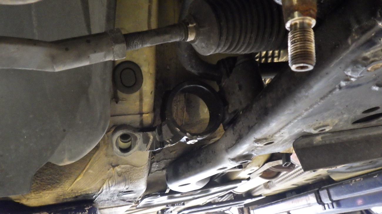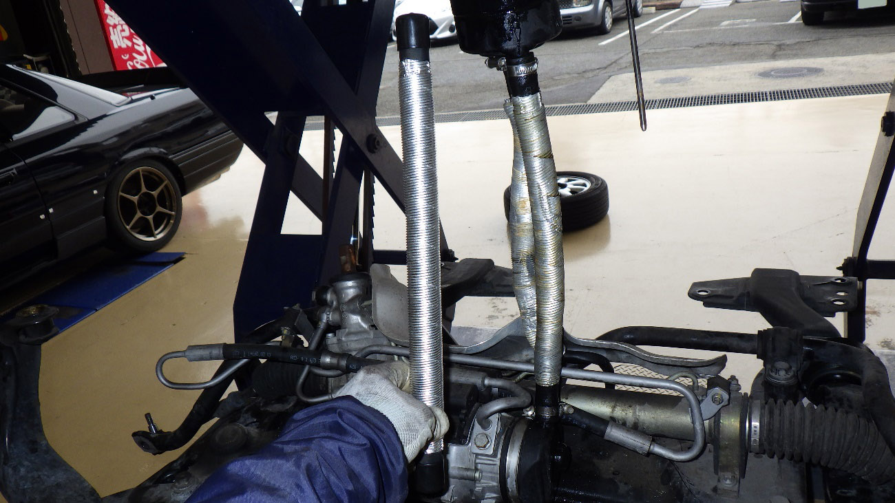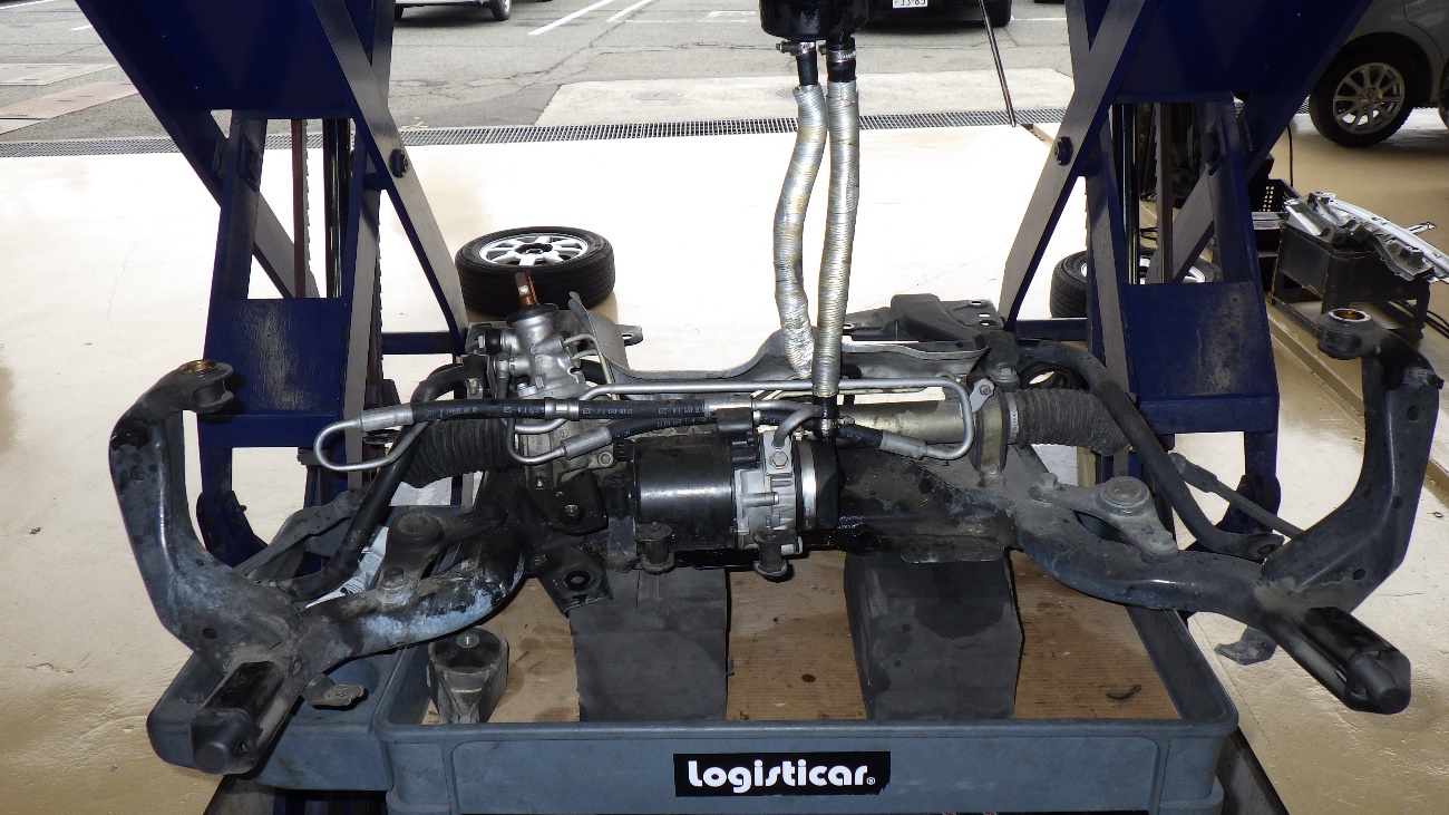 左右ロアアームブッシュ、パワステのリターンホース交換後サブフレームを組付けを行っている様子になります。