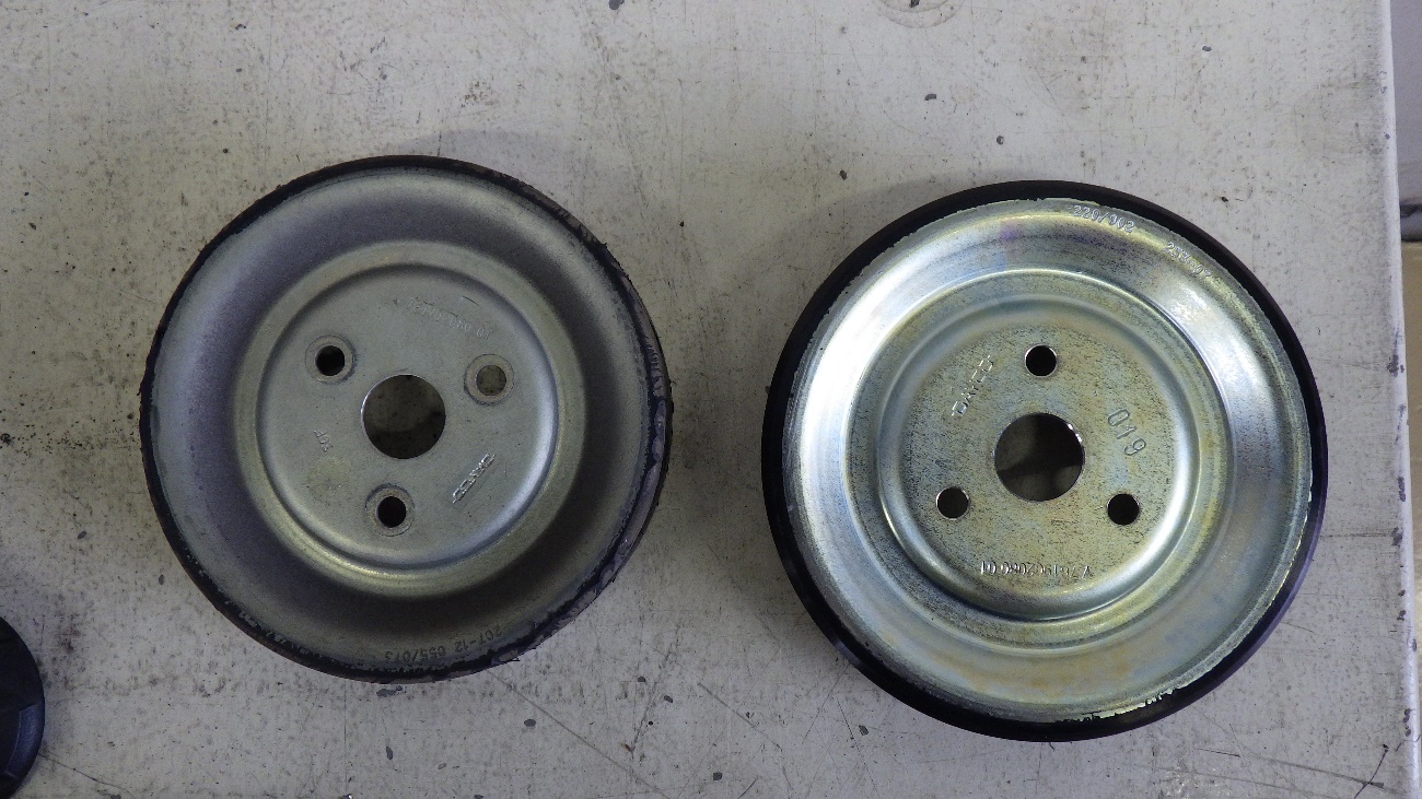 ウォーターポンププーリーを新品部品と比較した状態です。