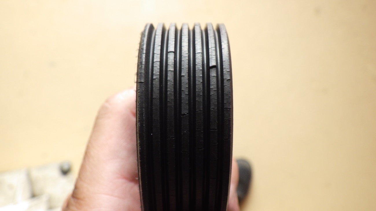 ドライブベルトの拡大図になります。無数の亀裂が入っておりました。