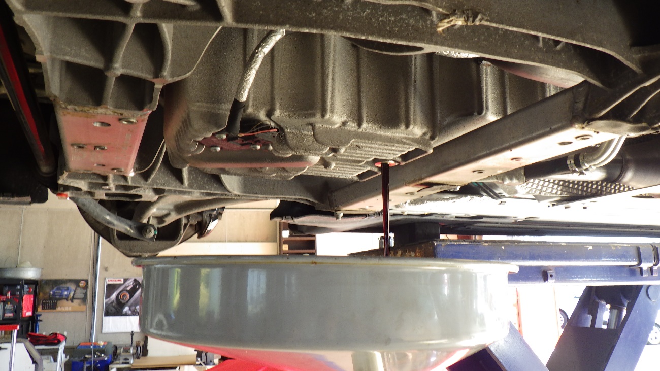リフトアップを行い、エンジンオイルを排出している様子になります。