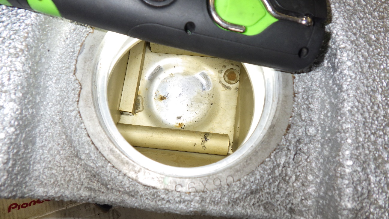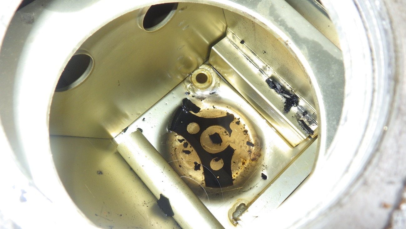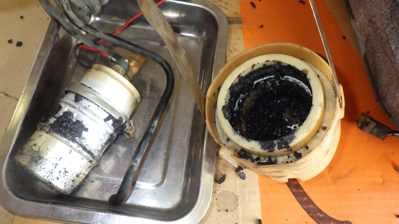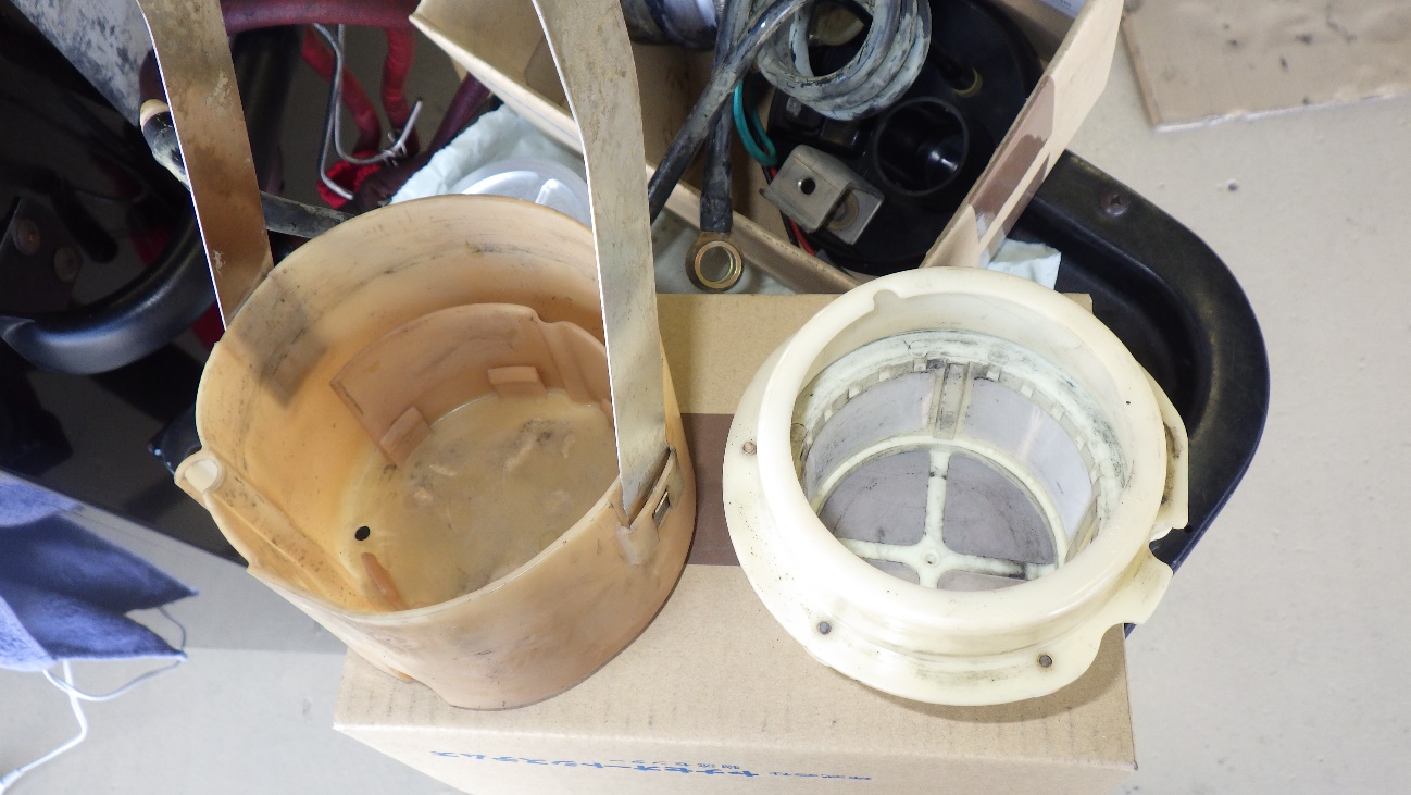 左がフューエルポンプ単体。右がポンプケースです。ネット等に良く挙げられている状態と同様でポンプユニット内部はタール状のものが溜まっており、