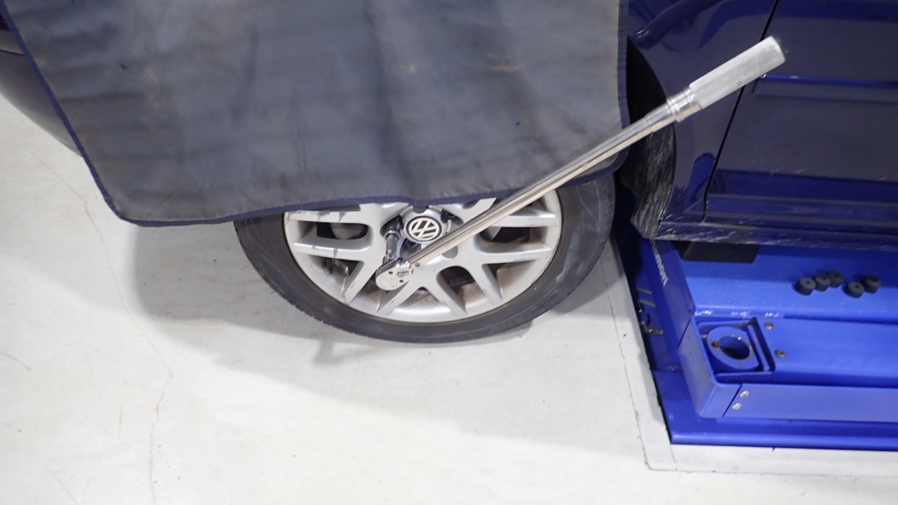 右フロント廻り損傷でのお預かりになります。 まず初めに、ホイールへの損傷があったので、足廻りの計測作業を行いました。 足廻りの計測を行ない、数値に問題が無い事を…
