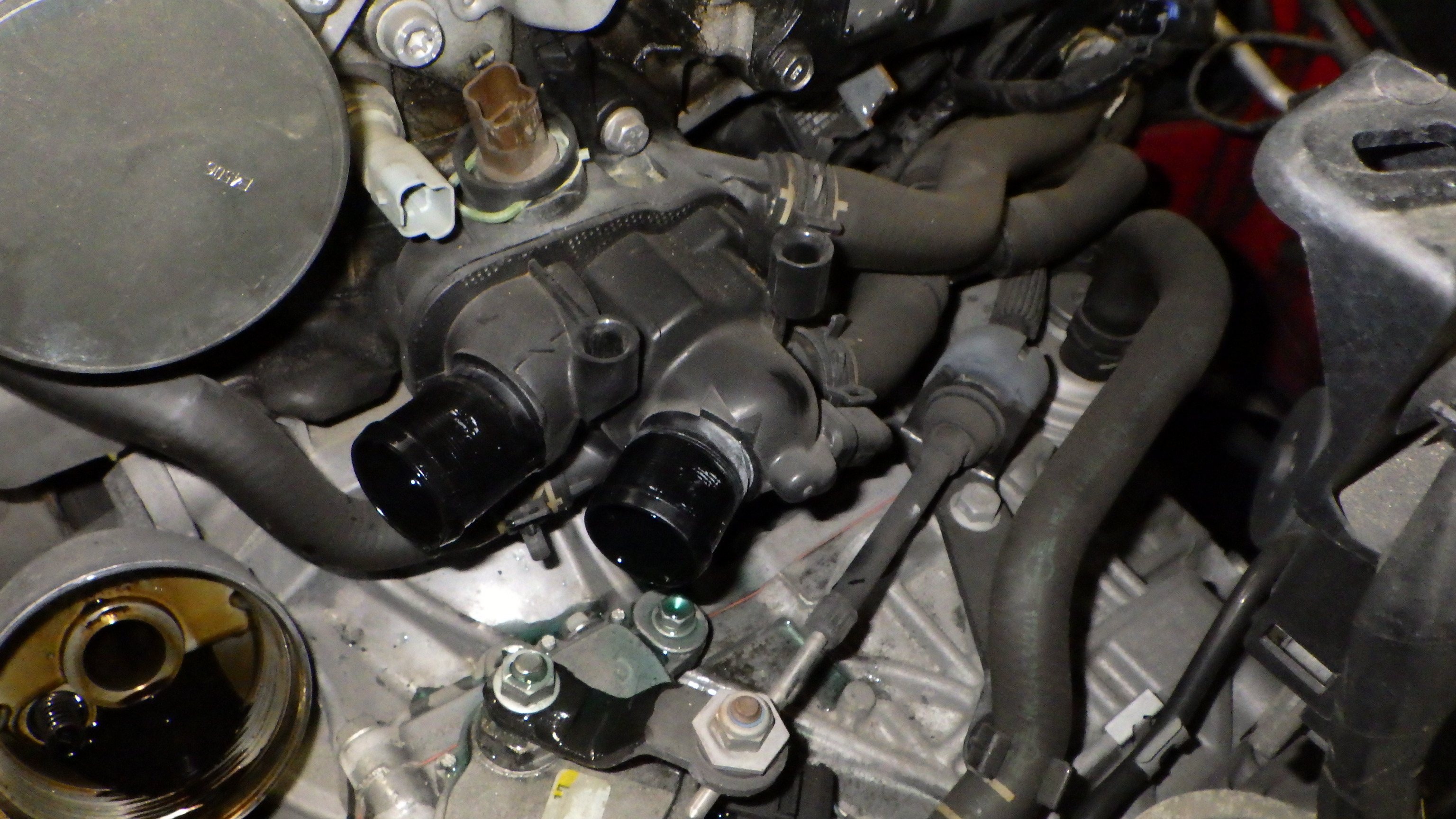 各部漏れの点検を実施し、サーモスタットケースより漏れが発生していました。