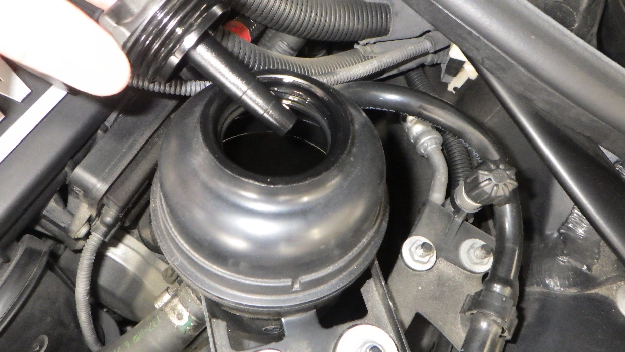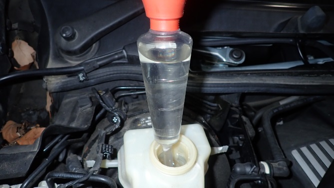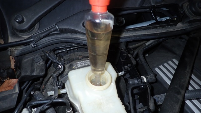 組付け後新品のクーラントを補充しています。