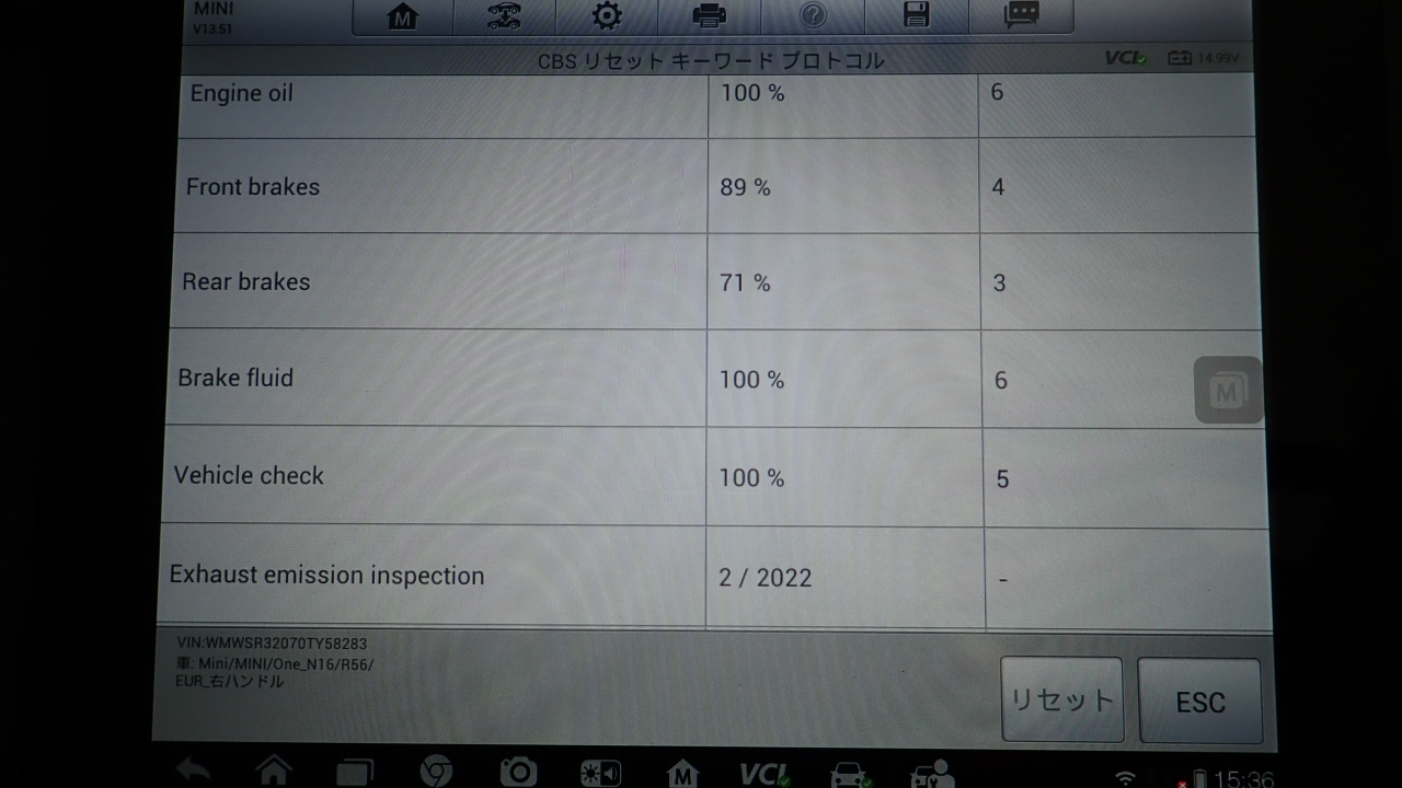 テスターにて故障コードの確認と、サービスのリセットを実施しています。