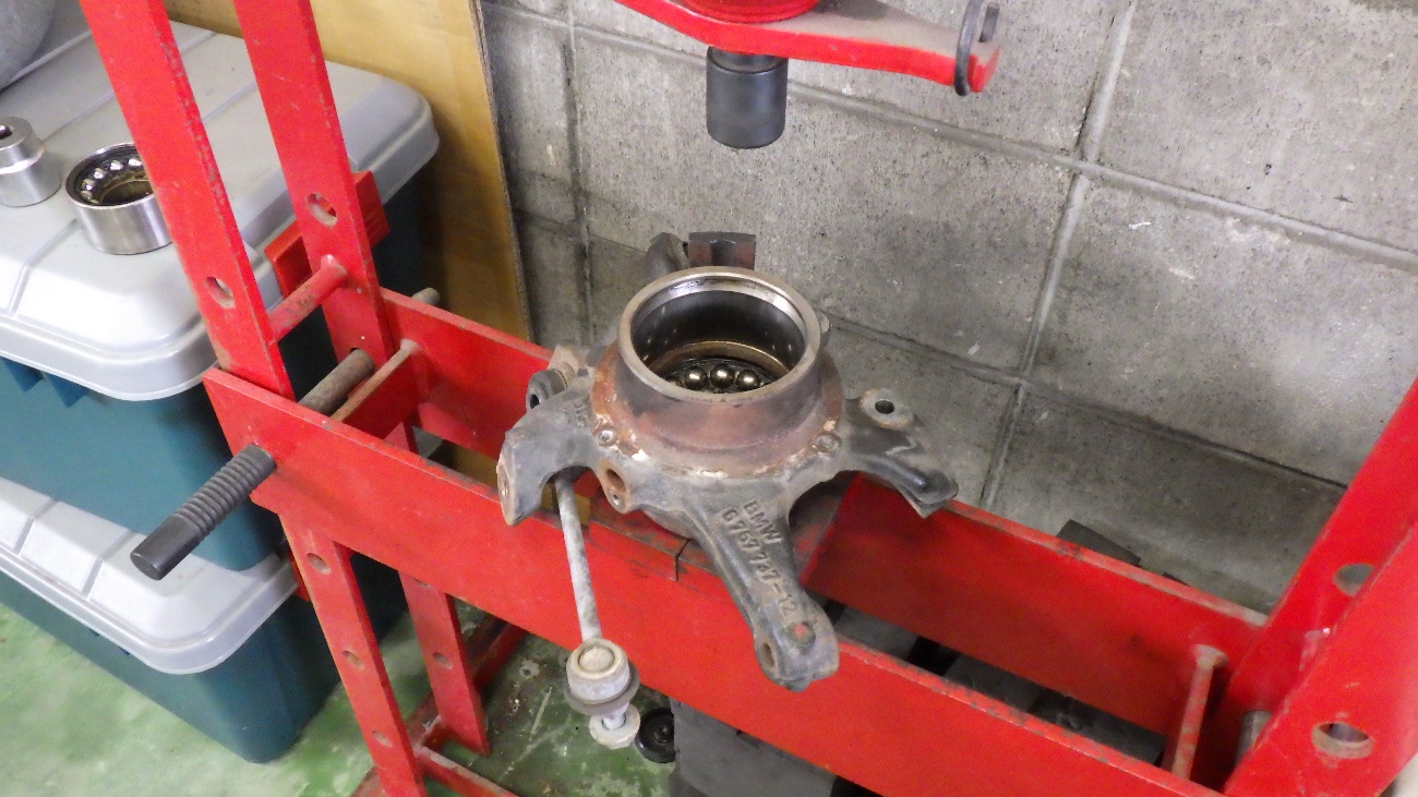 ハブベアリング圧入式ですのでプレス機で取り外していきます。