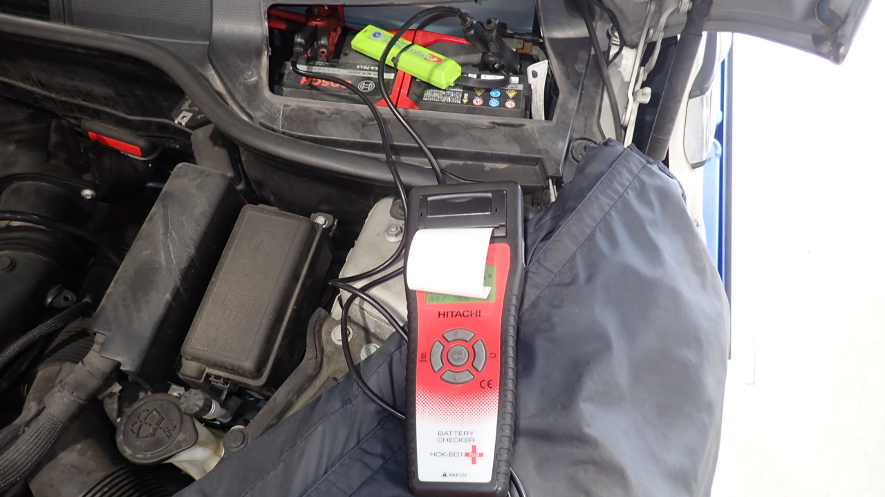 テスターにてバッテリーの点検を実施しています。