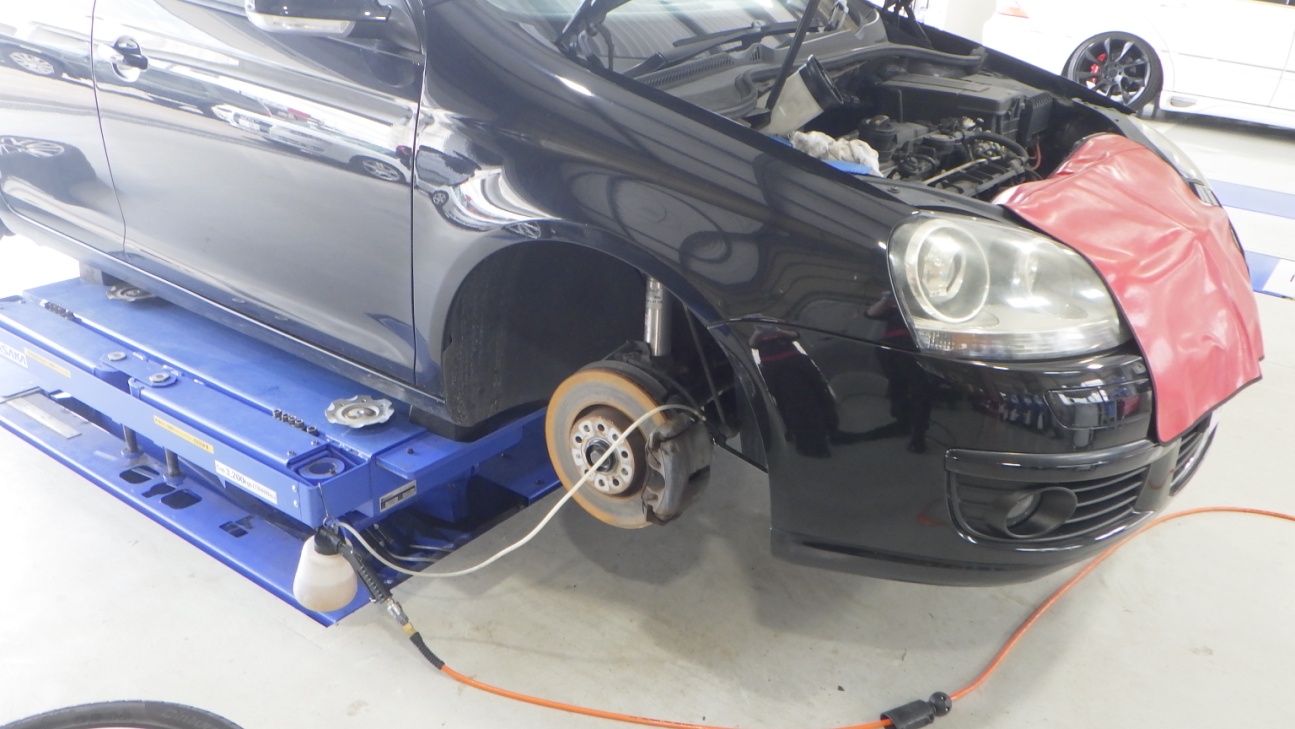 右フロント廻り損傷でのお預かりになります。 まず初めに、ホイールへの損傷があったので、足廻りの計測作業を行いました。 足廻りの計測を行ない、数値に問題が無い事を…