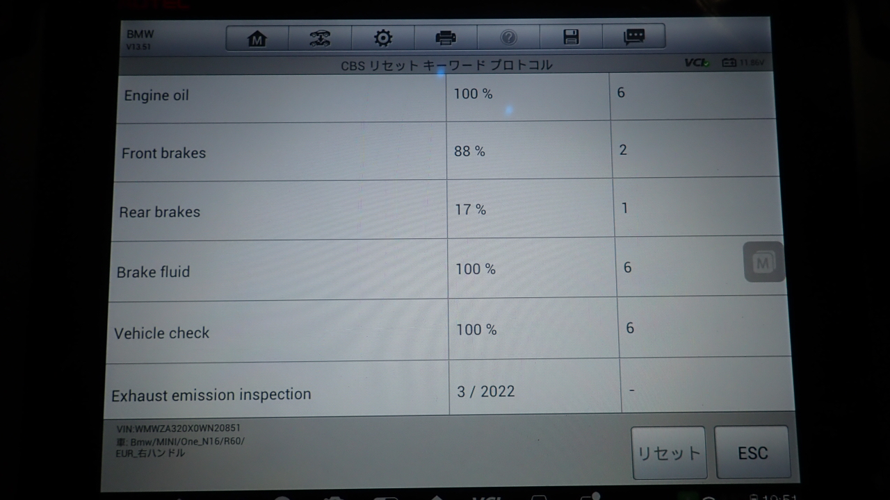 テスターにて故障コードの確認と、サービスのリセットを実施しています。