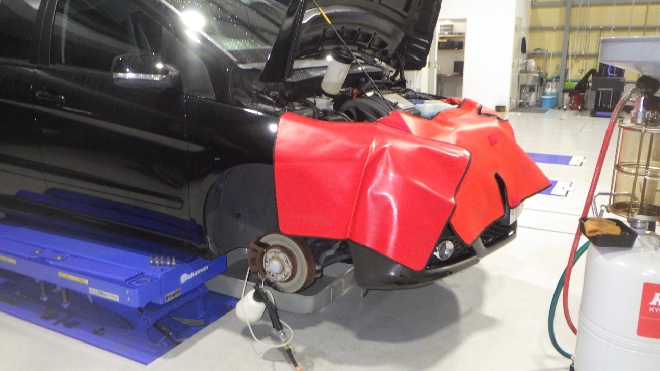 フロント足廻り損傷でのお預かりになります。 入庫後、入庫確認作業を行い、キズ、汚れ防止の為、ハンドルカバー、 シートカバーの取り付けを行いました。 入庫確認の後…