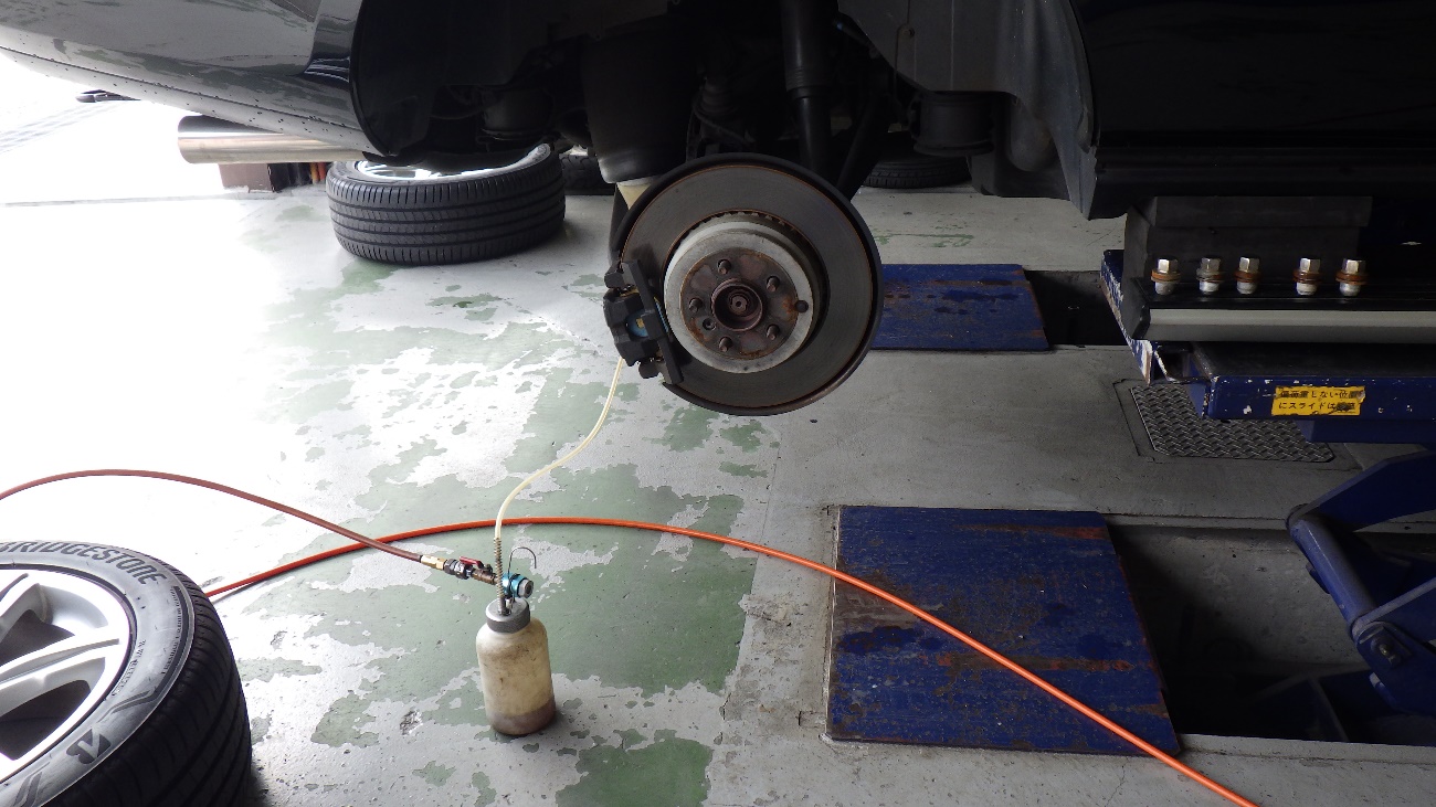 フロント側のブレーキオイルの交換作業様子です。