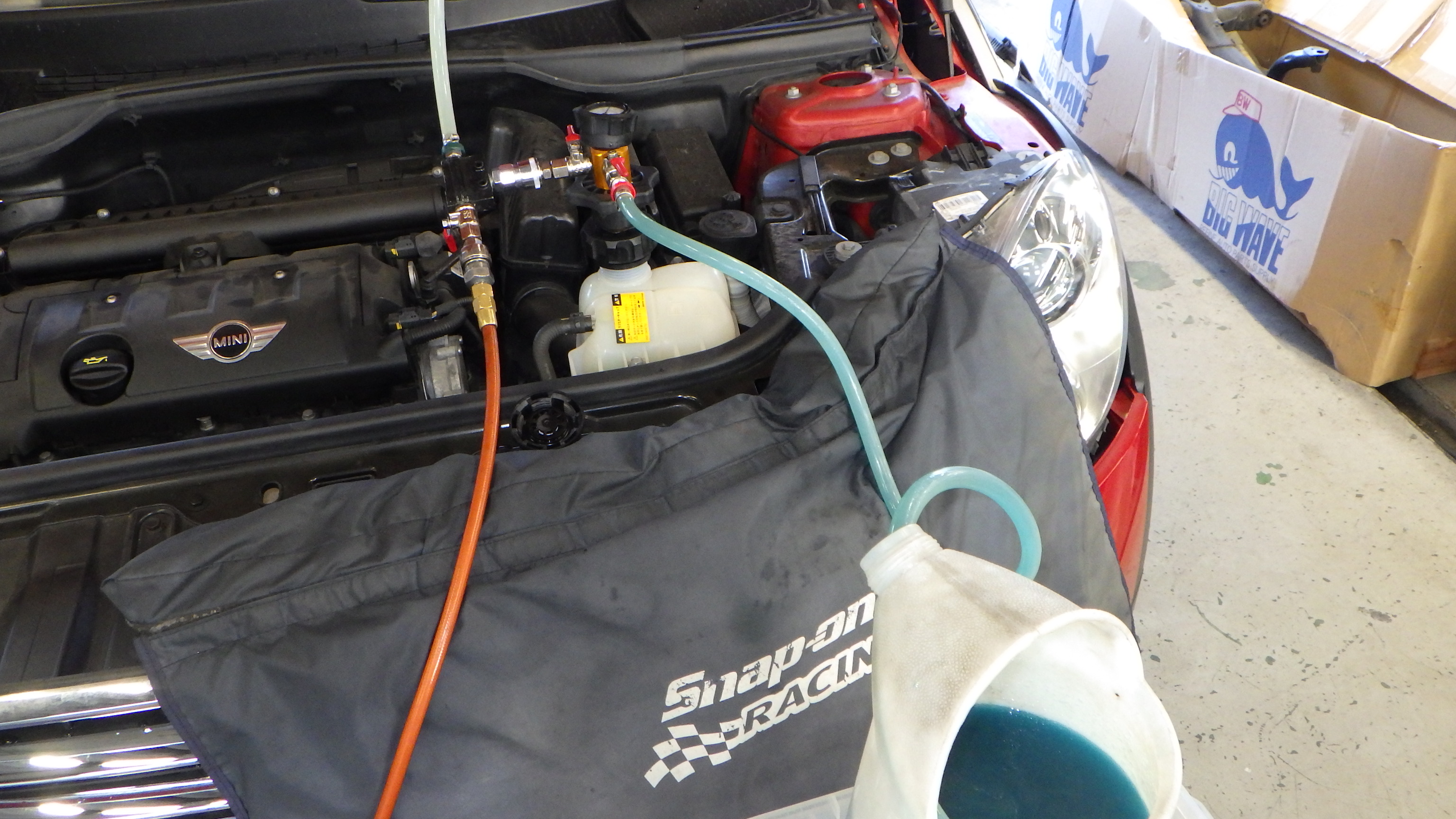冷却系統を真空にし、新品のクーラントを補充していきます。