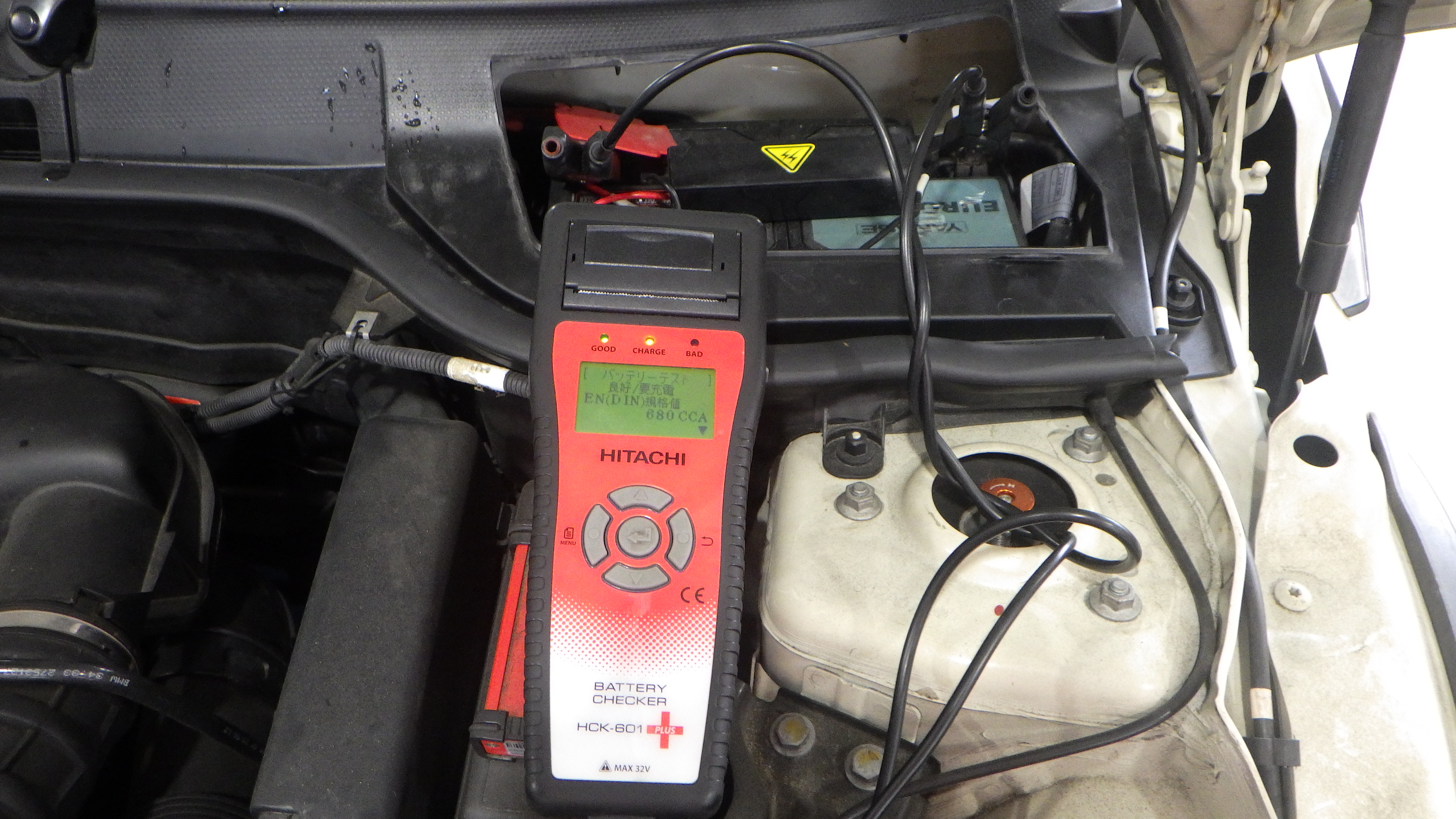 テスターにてバッテリーの点検を実施しています。