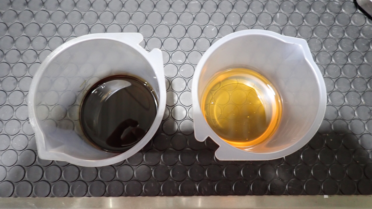 交換前、交換後のオイルです。 交換後オイル量の点検も実施しています。