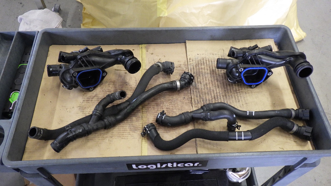 取り外したサーモケース及びヒーターホース類2つです。