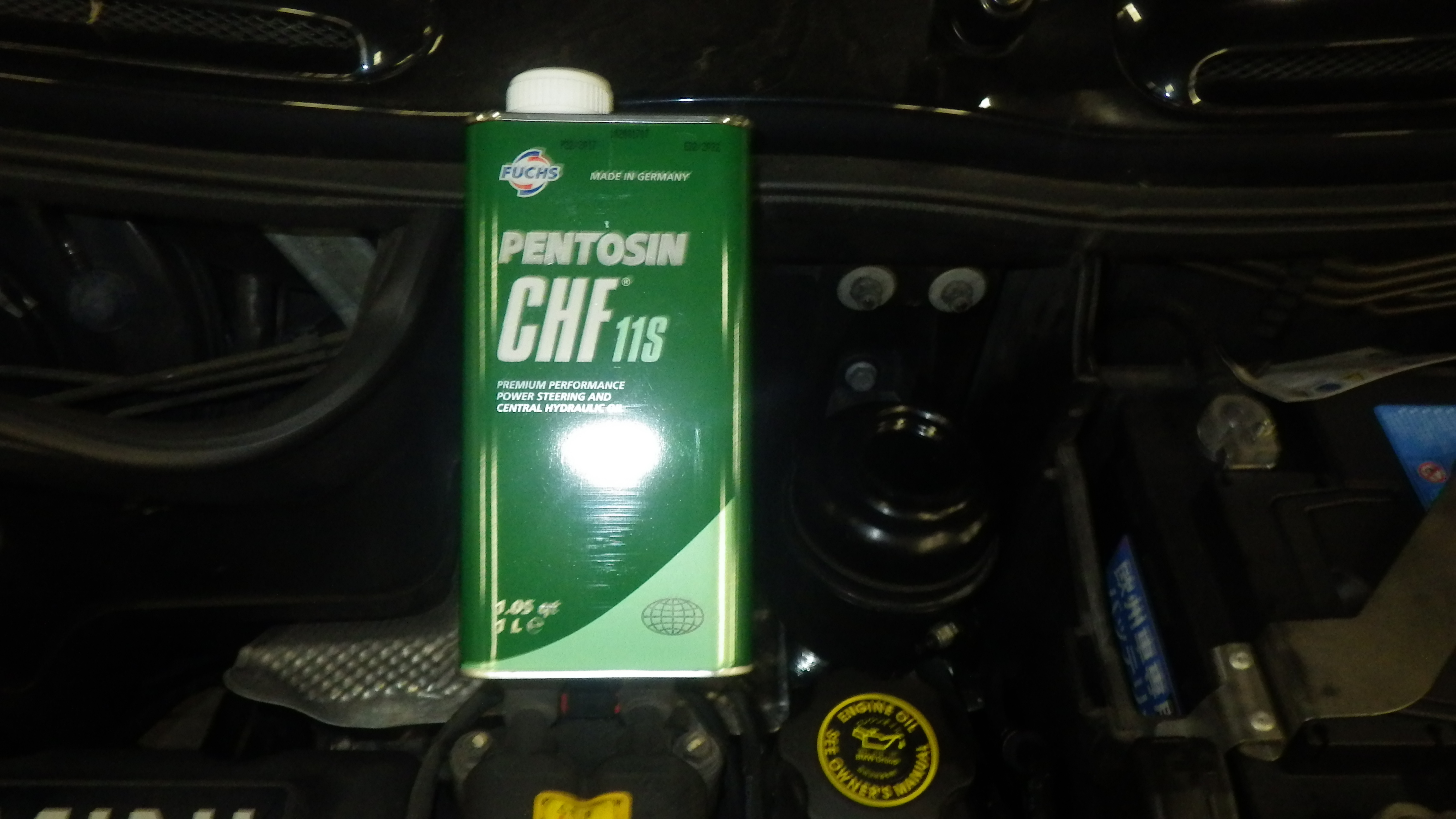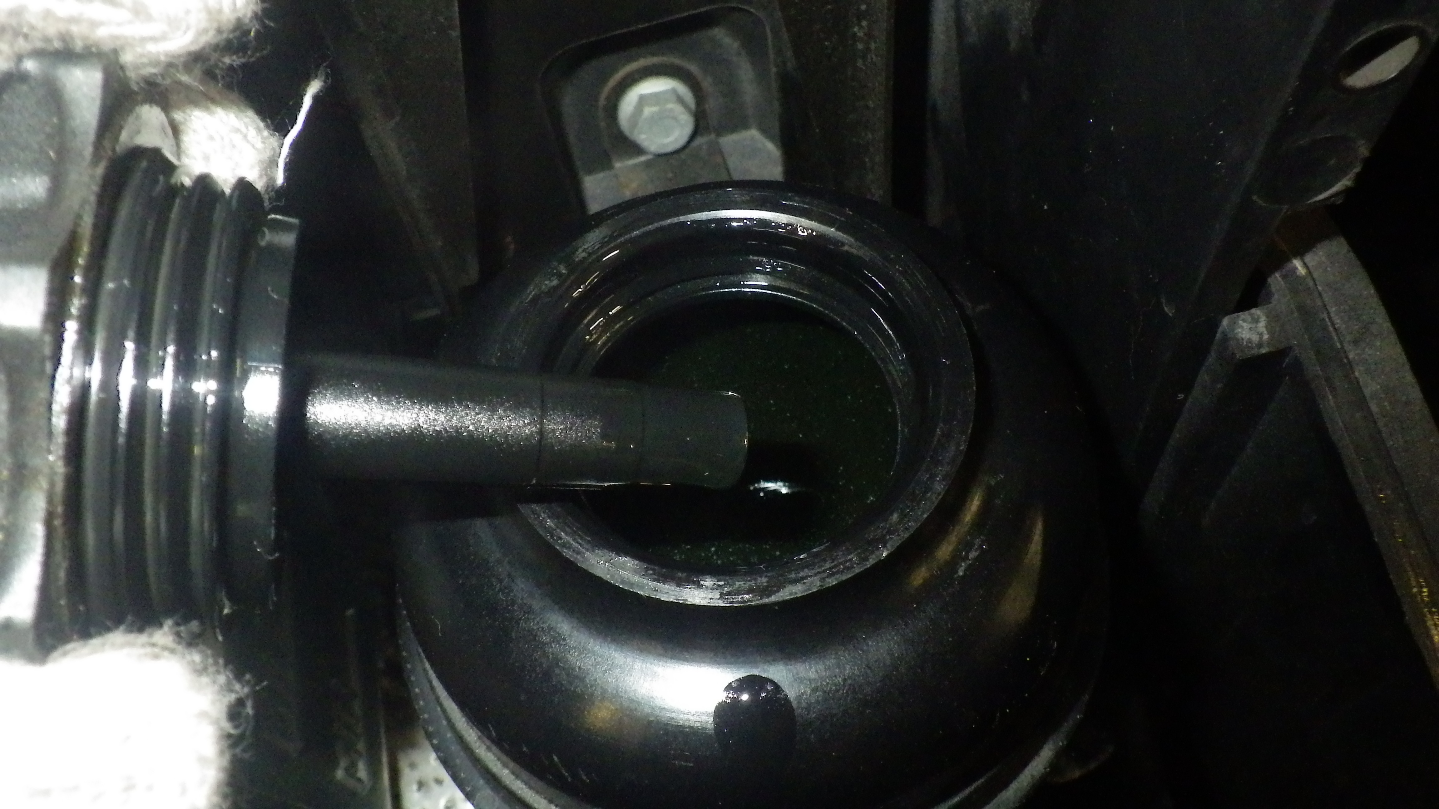 組付け完了後新品のパワーステアリングフルードを補充しています。