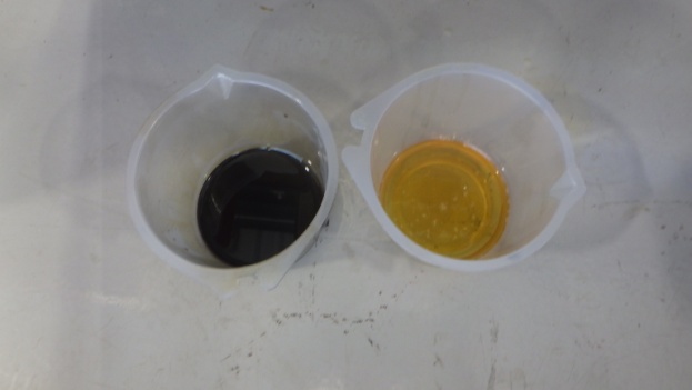 交換前、交換後のエンジンオイルです。オイル量の点検も実施しています。