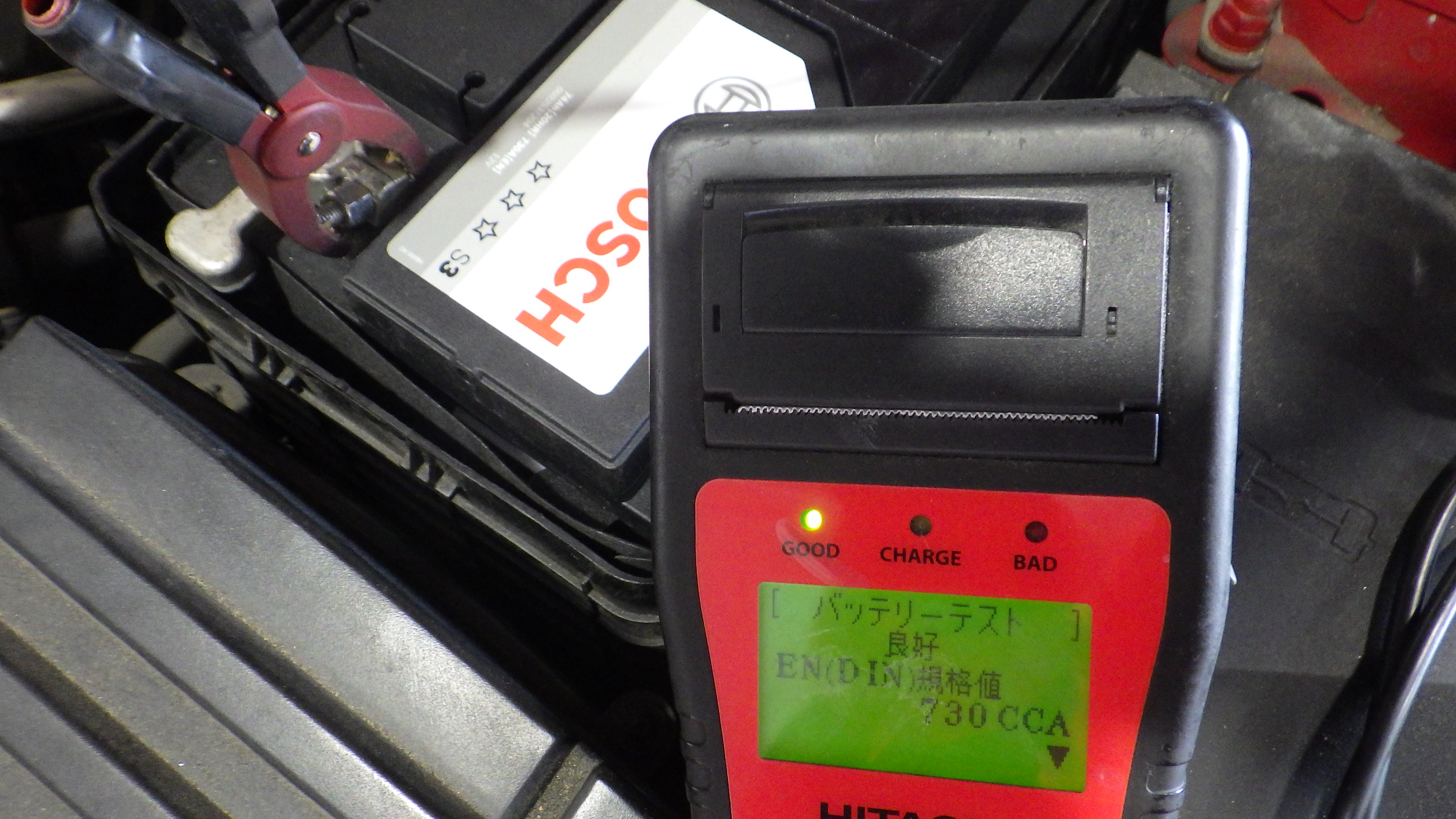 テスターにてバッテリーの点検を実施しています。