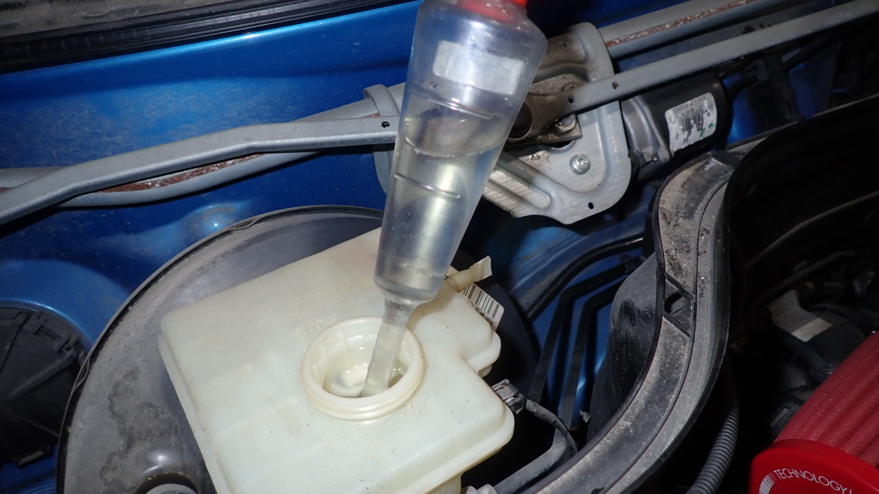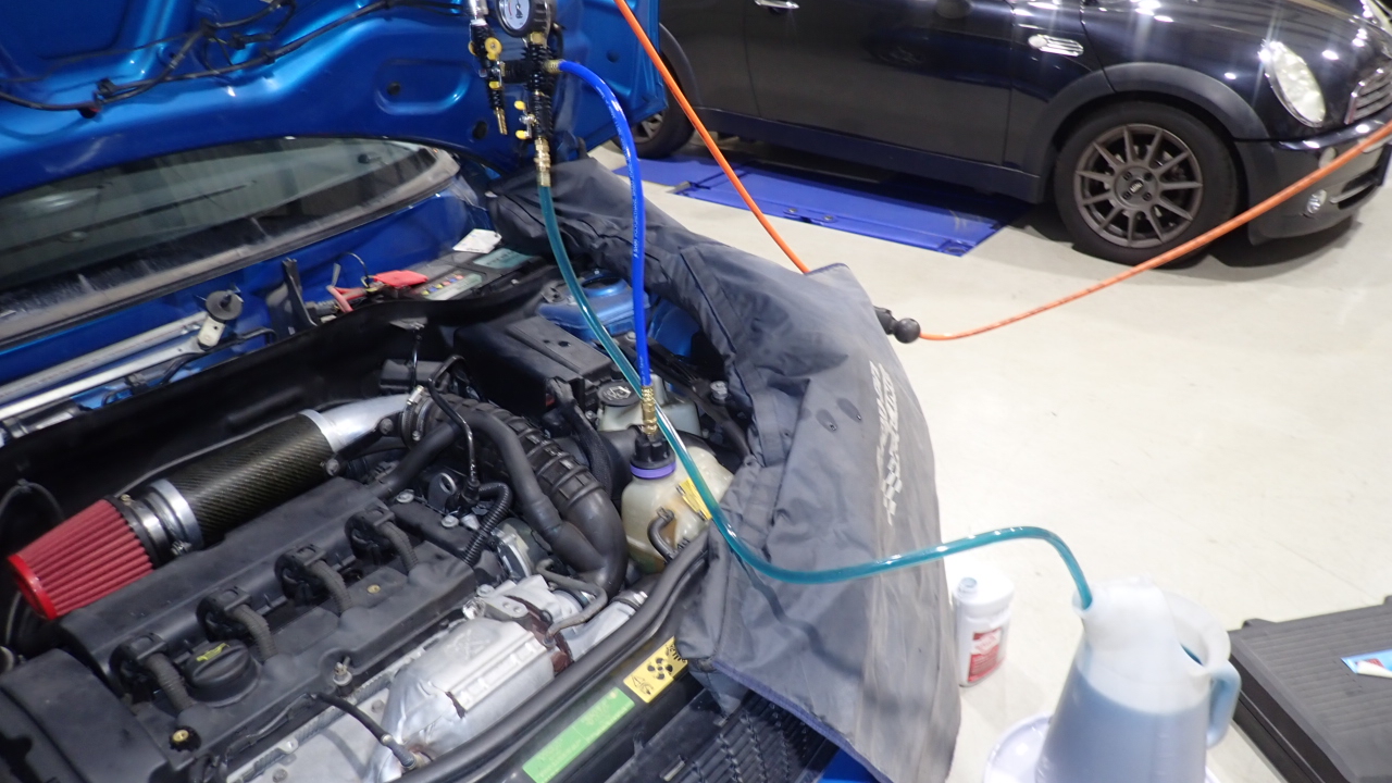 交換後、冷却系統を真空にし新品のクーラントを補充しています。