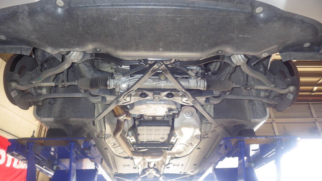 アンダーカバーを外した状態のフロント部の下廻りの点検様子になります。