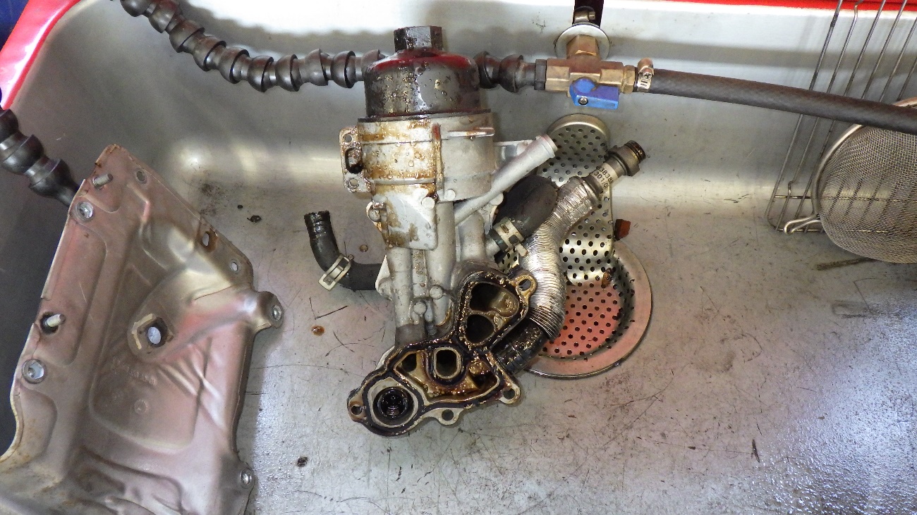 タペットカバーになります。オイルが下に垂れて、熱で硬化しておりました。