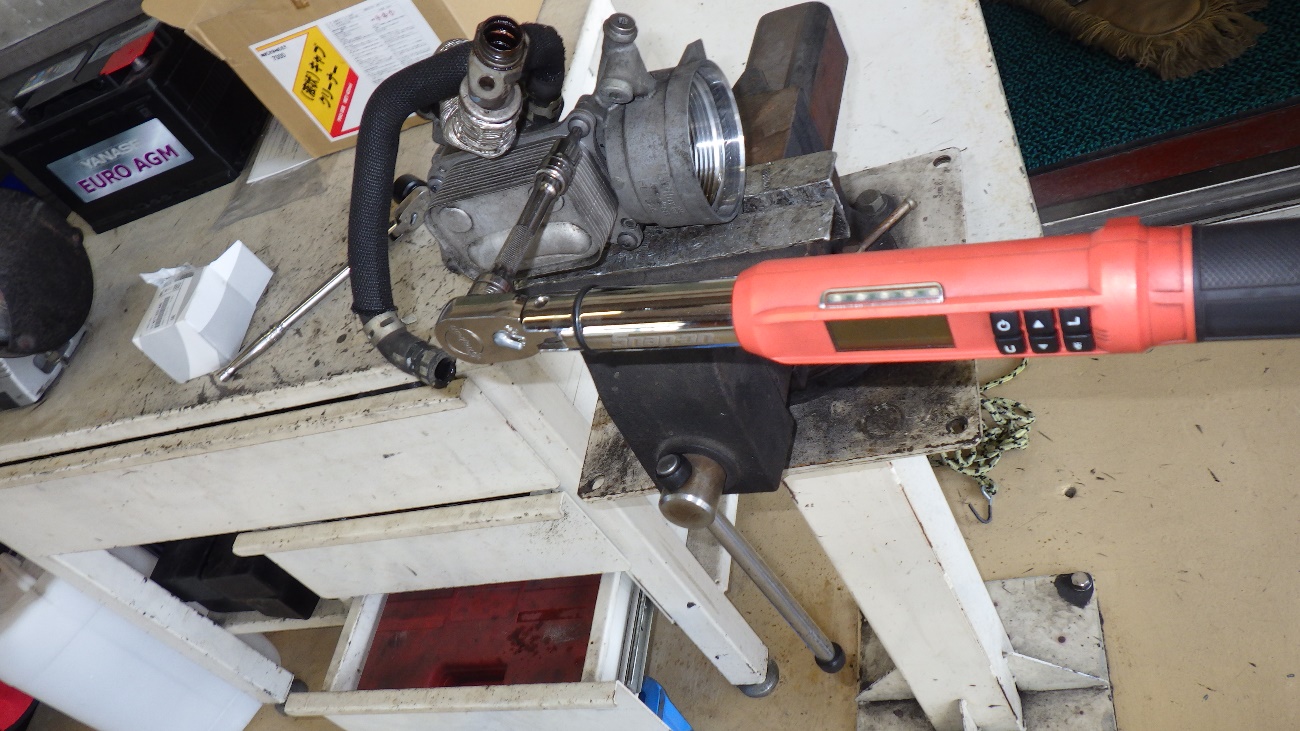 全て清掃を行ってエンジンオイルフィルターハウジングを組付けている様子になります。