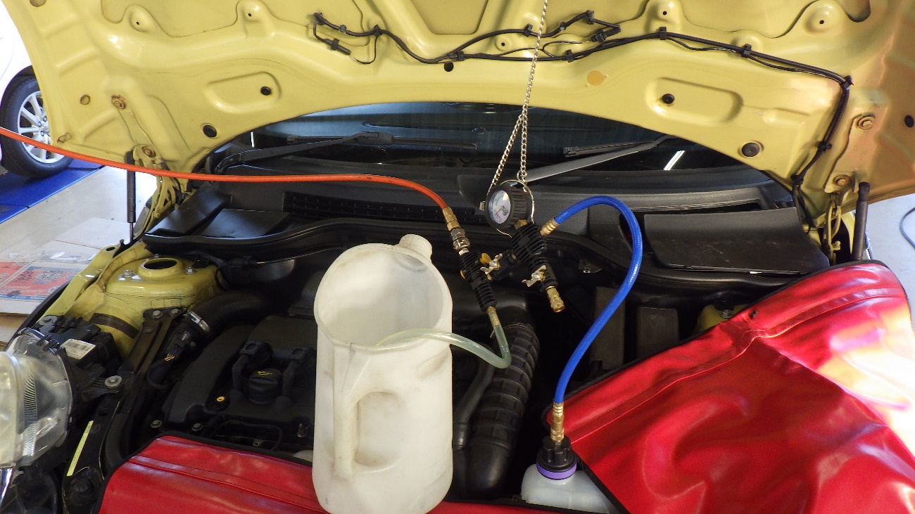 クーラントを排出しているので、クーラントの真空引き、チャージ、リークのチェックを行っている様子になります。