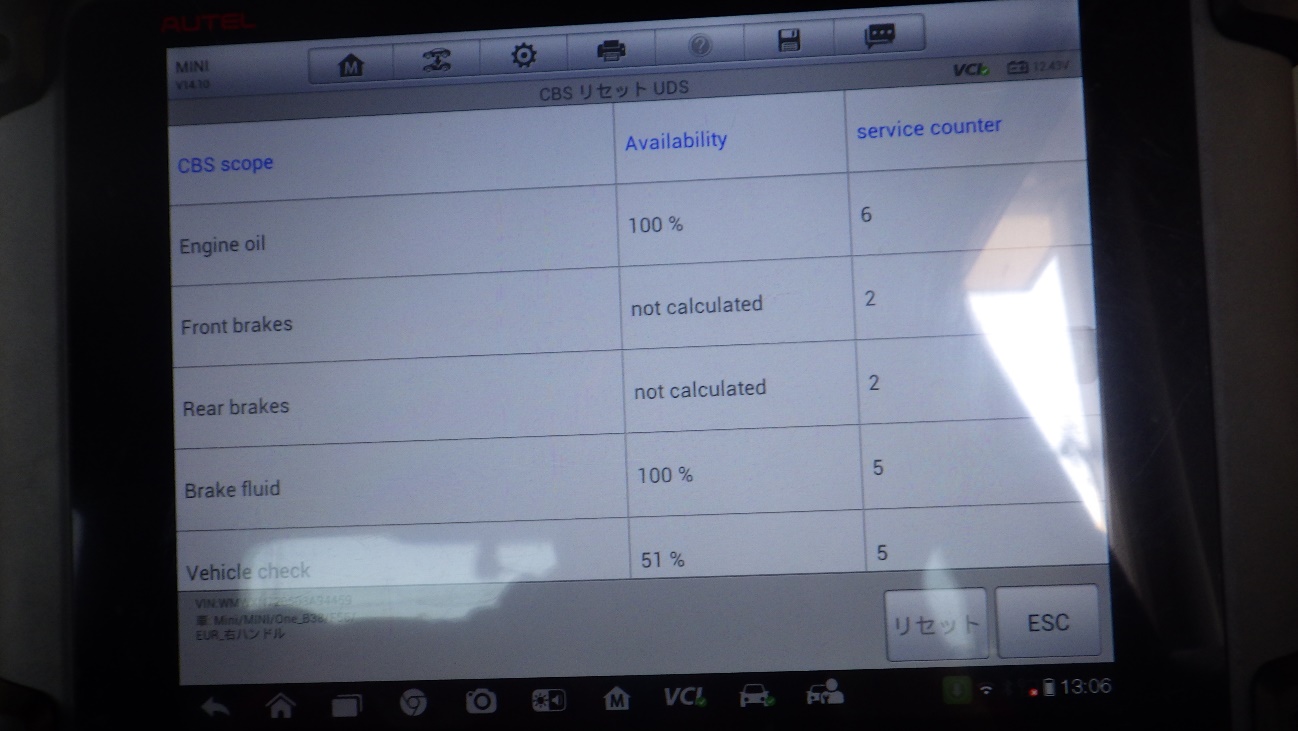 テスターにて故障コードの確認と、サービスのリセットを実施しています。