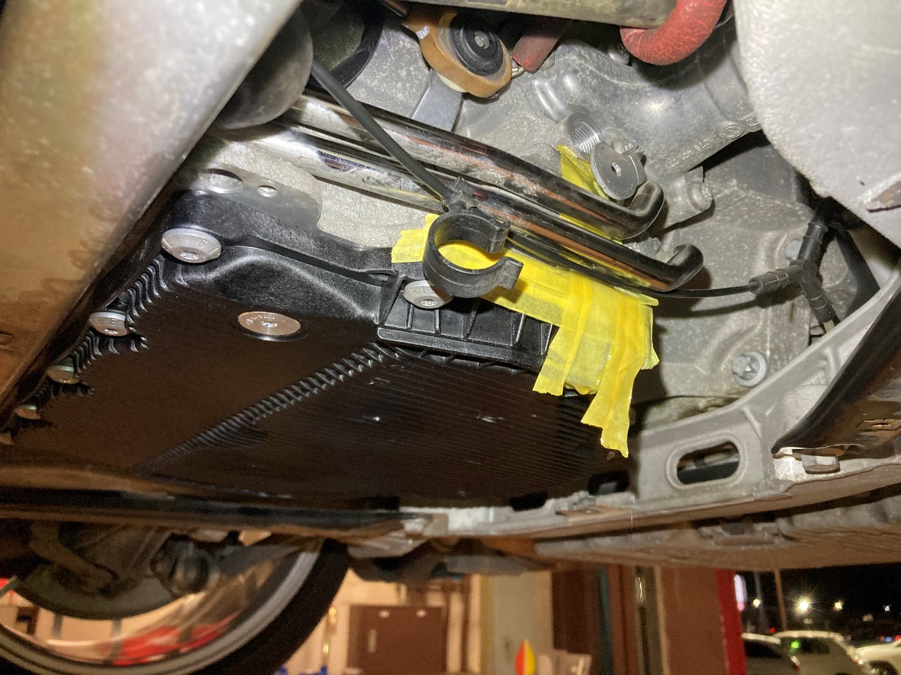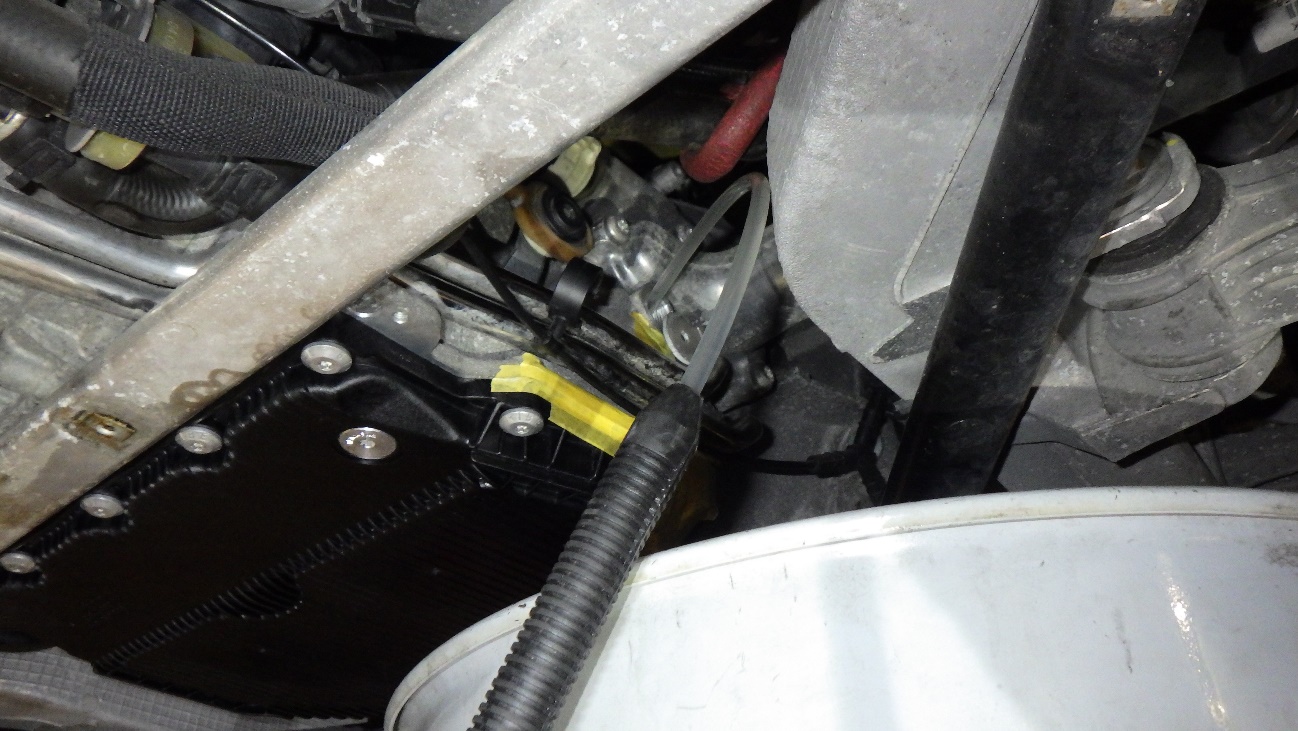 PDKクラッチオイルの充填準備として、オイル量調整時に流れ出るオイルで周辺が汚れないようマスキングしています。