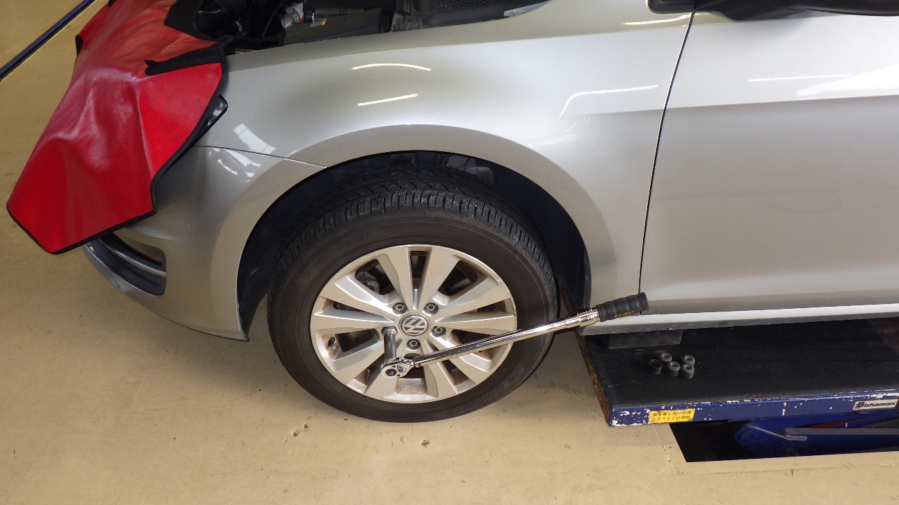右フロント廻り損傷でのお預かりになります。 まず初めに、ホイールへの損傷があったので、足廻りの計測作業を行いました。 足廻りの計測を行ない、数値に問題が無い事を…