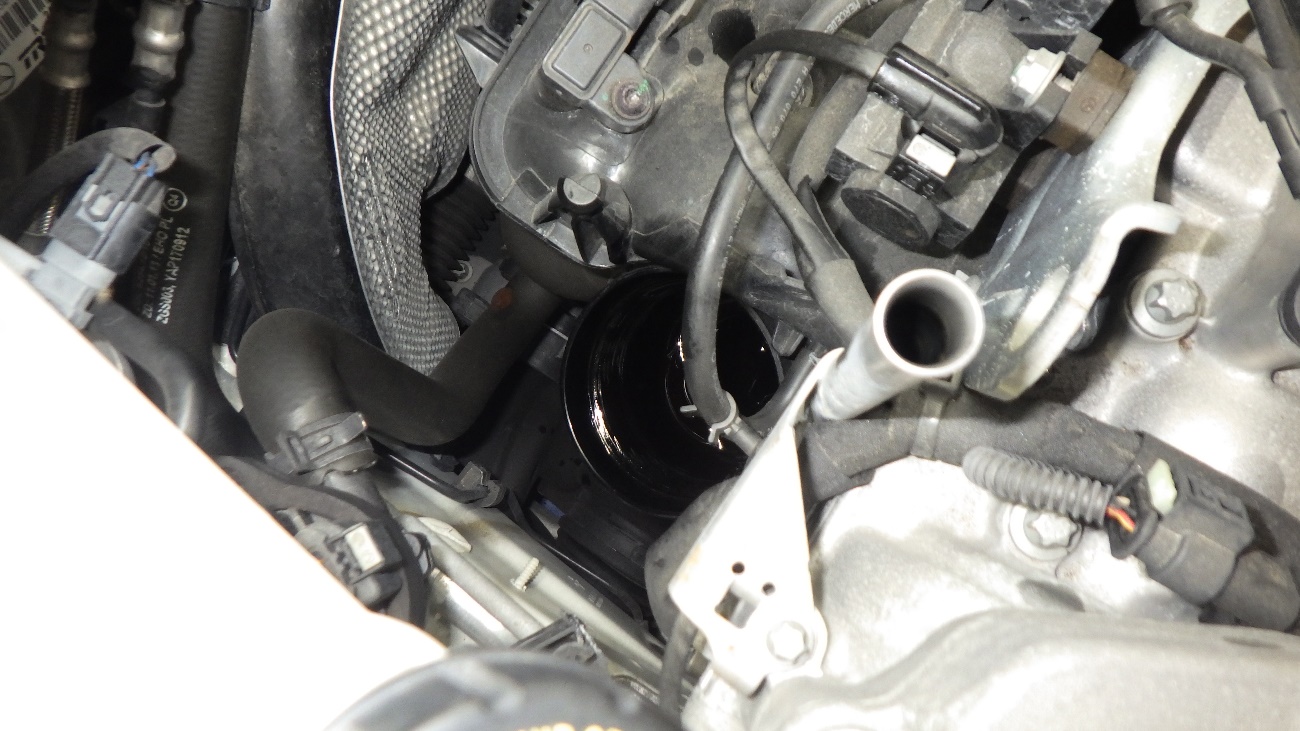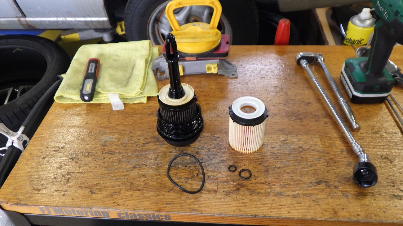エンジンオイルフィルターを取り外している様子になります。