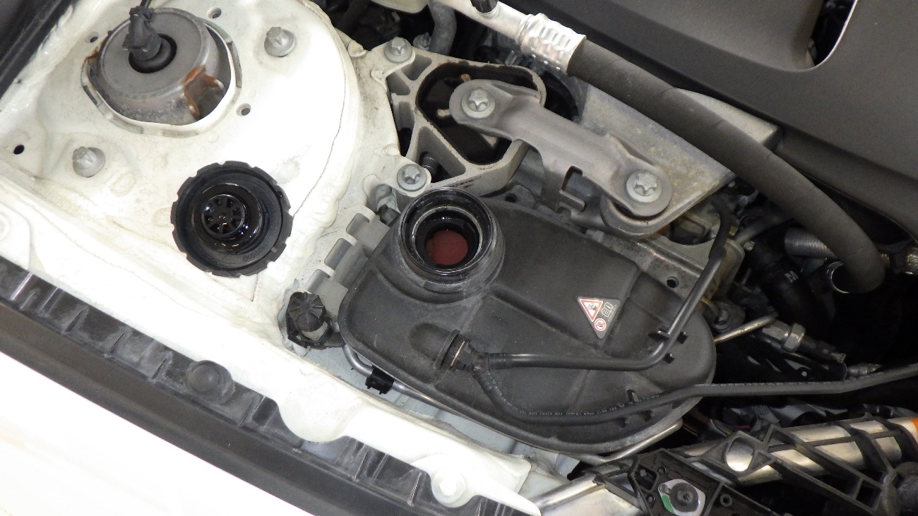 クーラントを補充している様子になります。補充後LLCサブタンク下部からLLCが漏れておりました。