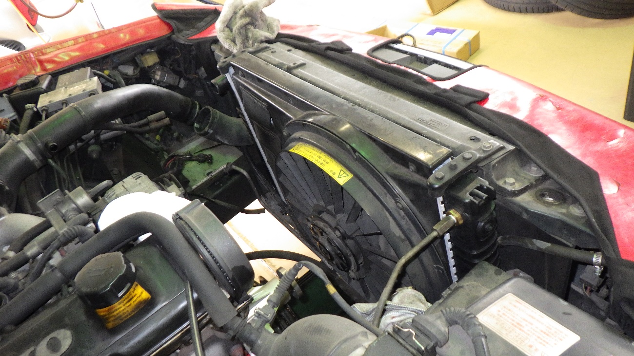 ラジエター交換後、電動ファンを組み付けた様子になります。