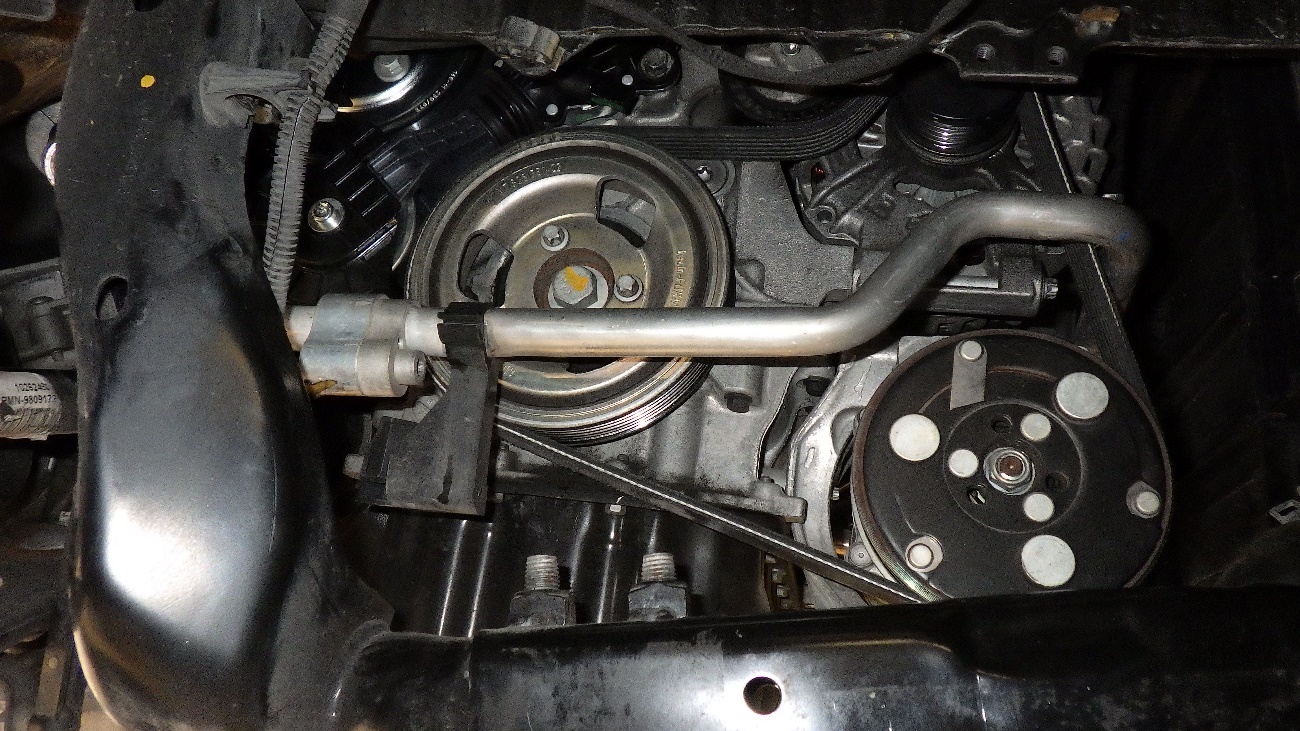 ウォーターポンププーリーのゴム部のはく離による異音と特定。早速取り外して参ります。