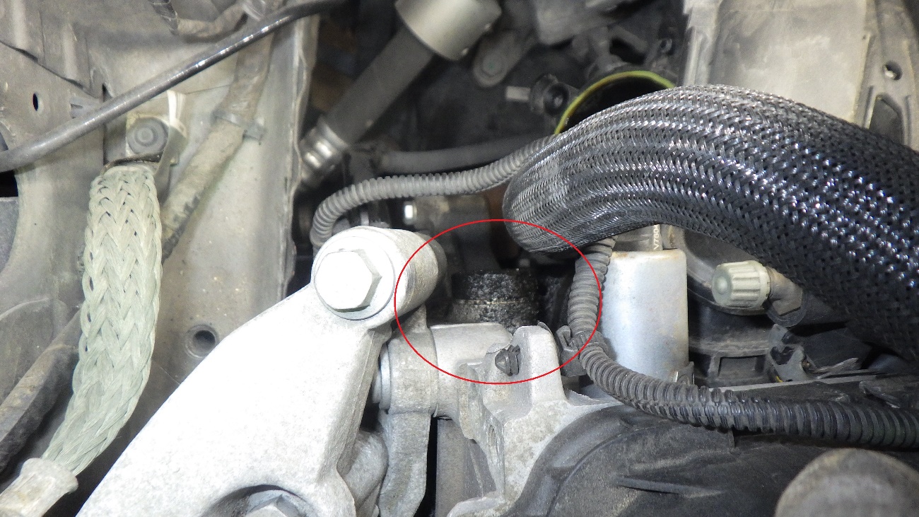 赤丸の部分がタイミングチェーンテンショナーの頭になります。