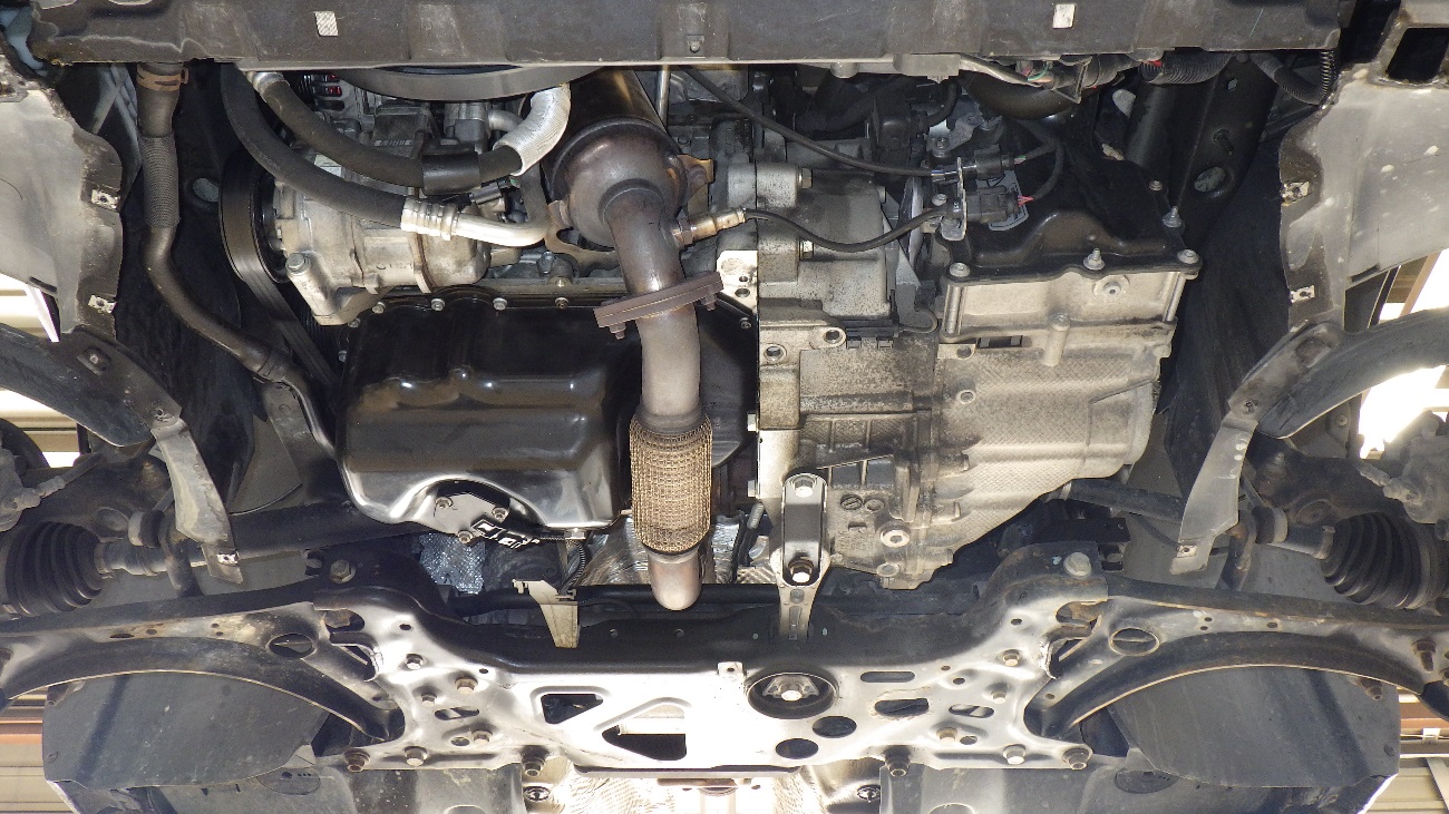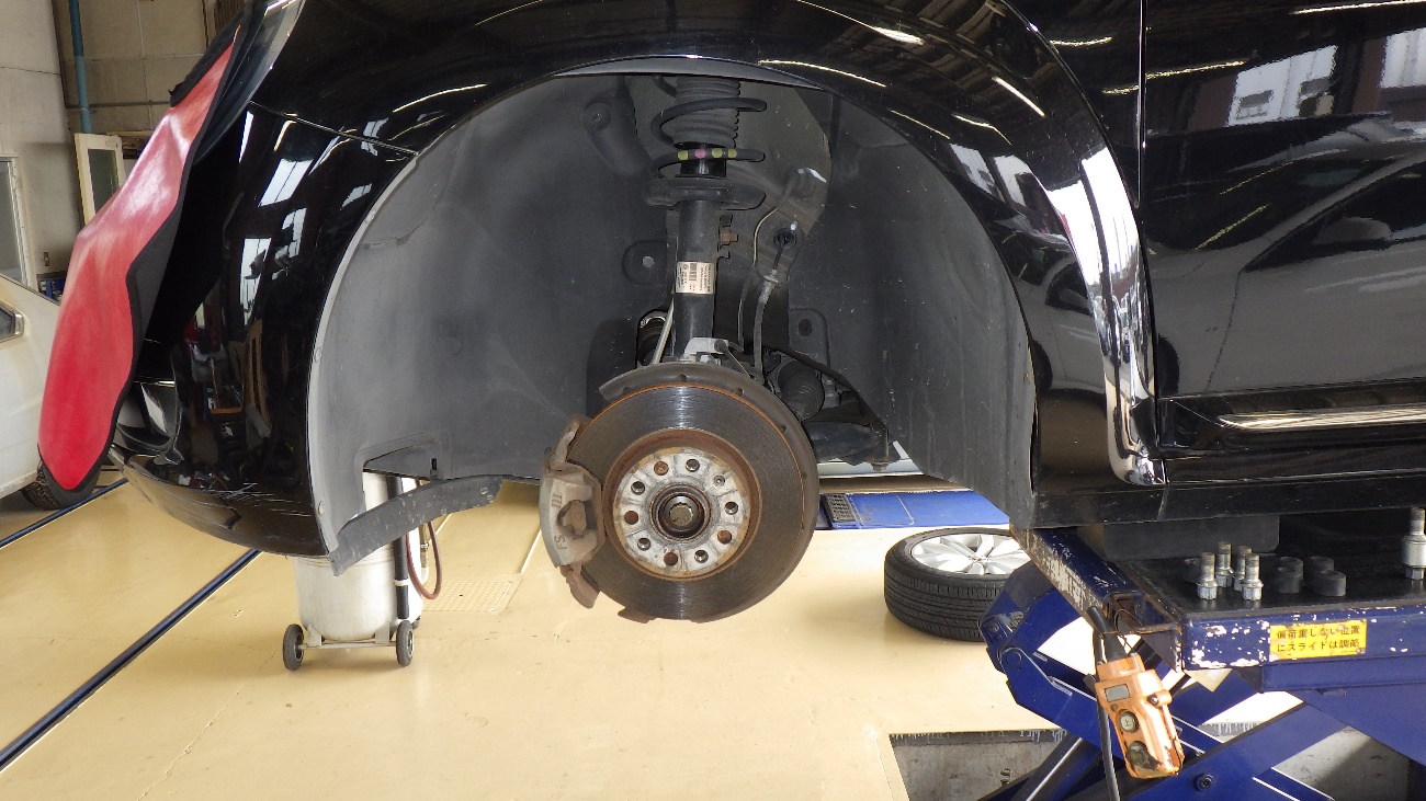 リフトアップを行い、下廻りの点検を実施。フロント側の様子になります。