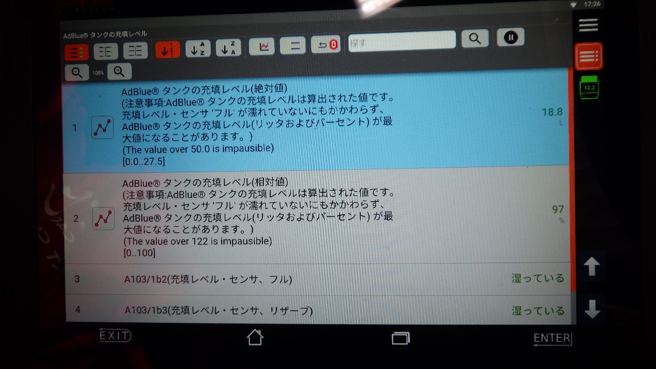 同時にテスターでアドブルーの状態を点検した結果、アドブルー量がほとんど満タンに対してテスター上ではほとんど入っていない数値でした。
