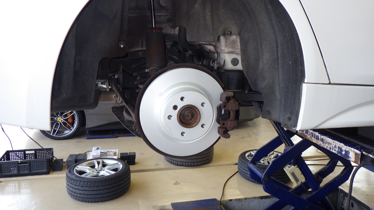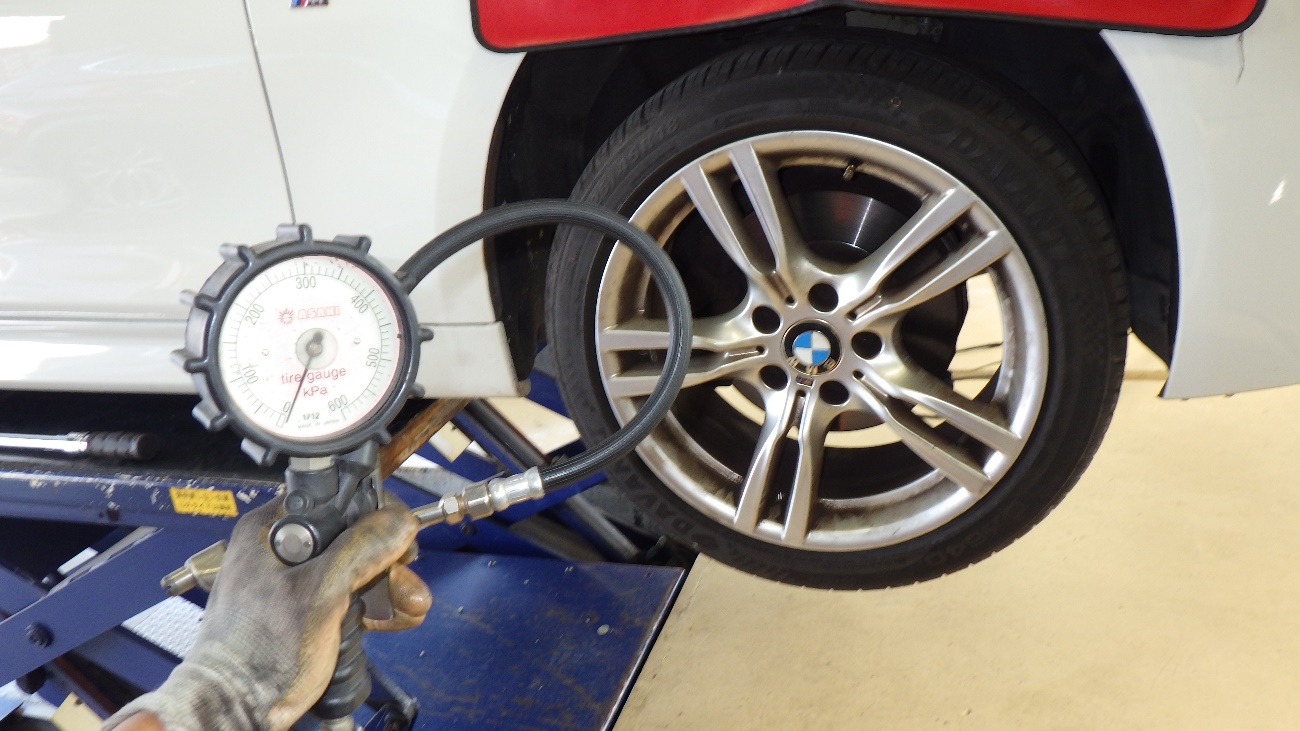 ブレーキオイル交換後、タイヤを組みつけて、空気圧の調整を実施しております。