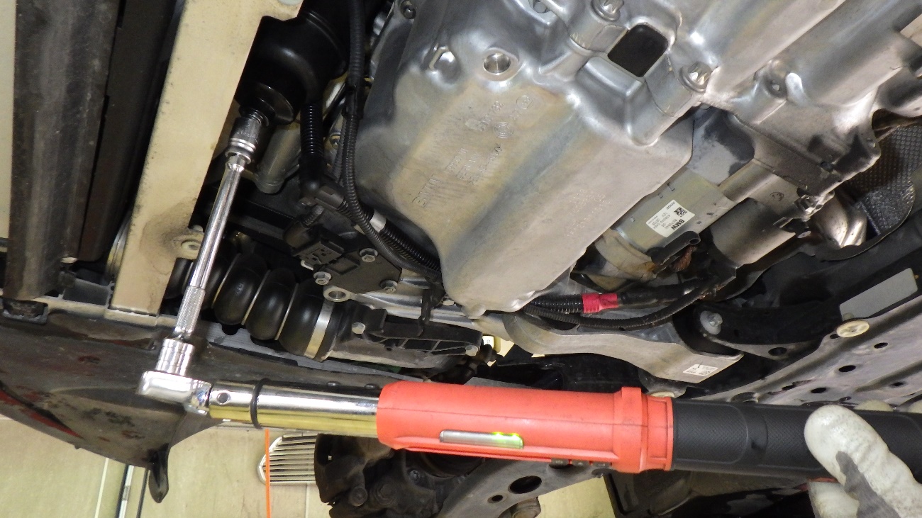 エンジンオイルフィルターを規定トルクにて締め付けております。