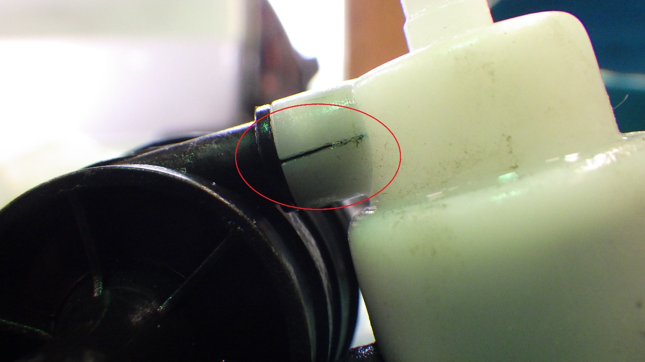 赤丸の部分が割れており、ここからウォッシャー液が漏れておりました。