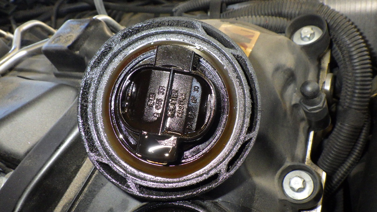エンジンオイルフィラーキャップも交換形跡が無くオイル漏れ跡もあり、エンジン警告灯